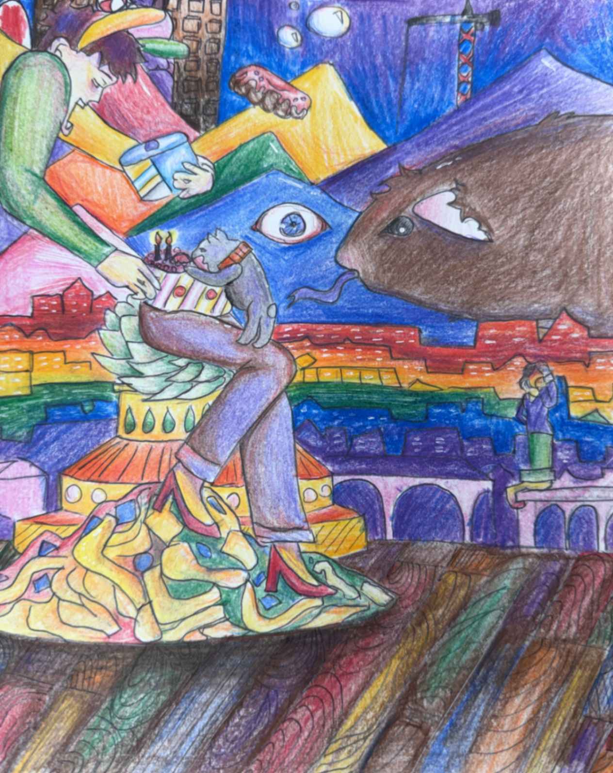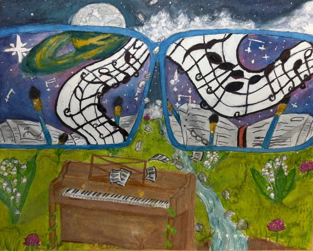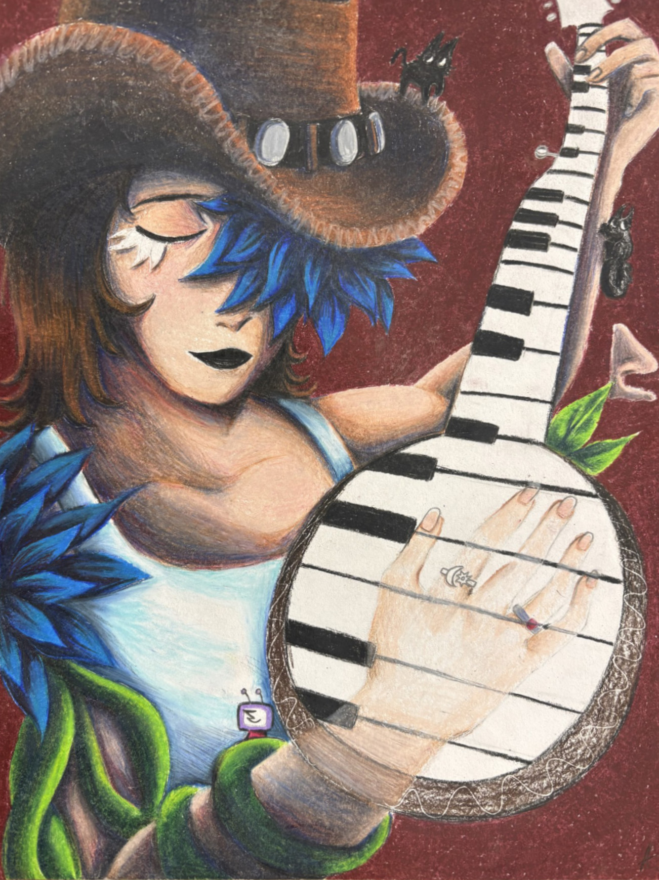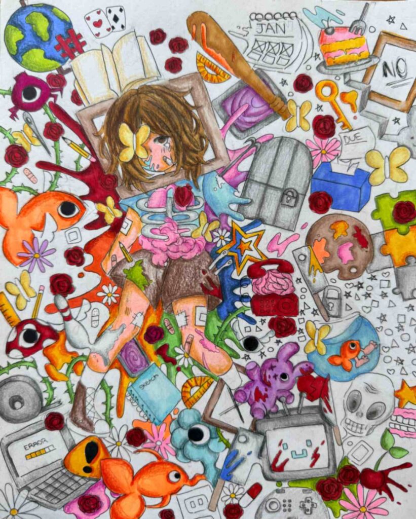 In Dreamstate Banjo, I created this artwork to express my love for music and create a dreamlike mood. I used a surreal style by blending a banjo with piano keys and adding unexpected objects to challenge reality. Inspired by surrealist art, I wanted the piece to feel strange yet bold. Using Prismacolor colored pencils, I focused on soft textures and strong colors to bring this imaginative scene to life.