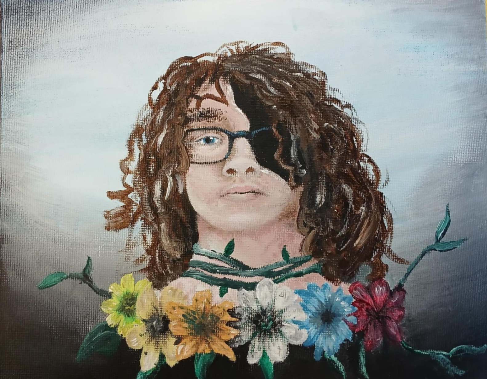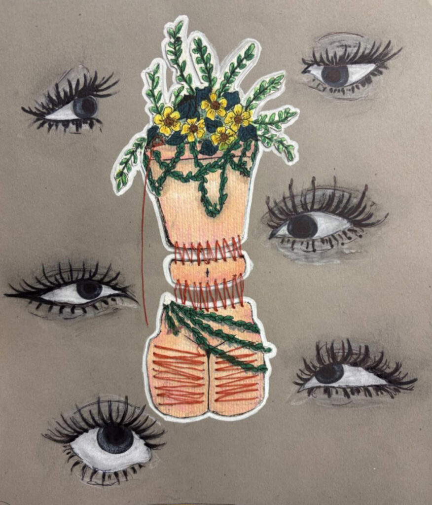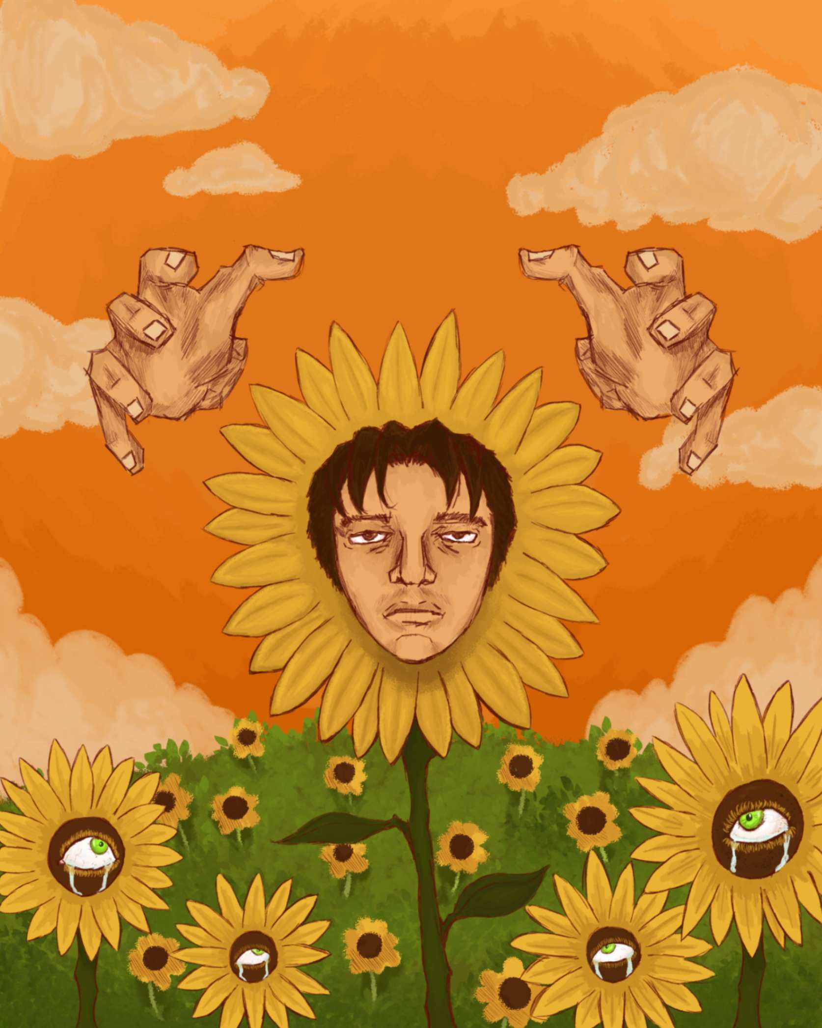 This a digital painting that I created using Adobe Photoshop. The topic of the assignment was to make a surreal representation of myself. I drew myself as a flower surrounded by other flowers and eyes to represent being constantly watched and judged by others. The hands in the background are my own hands, added to enhance the composition and create a sense of urgency.