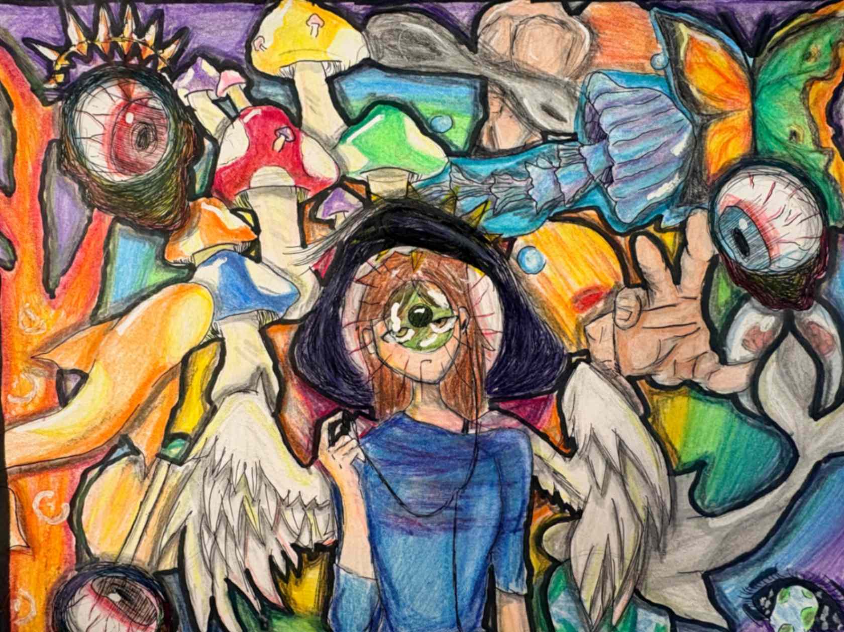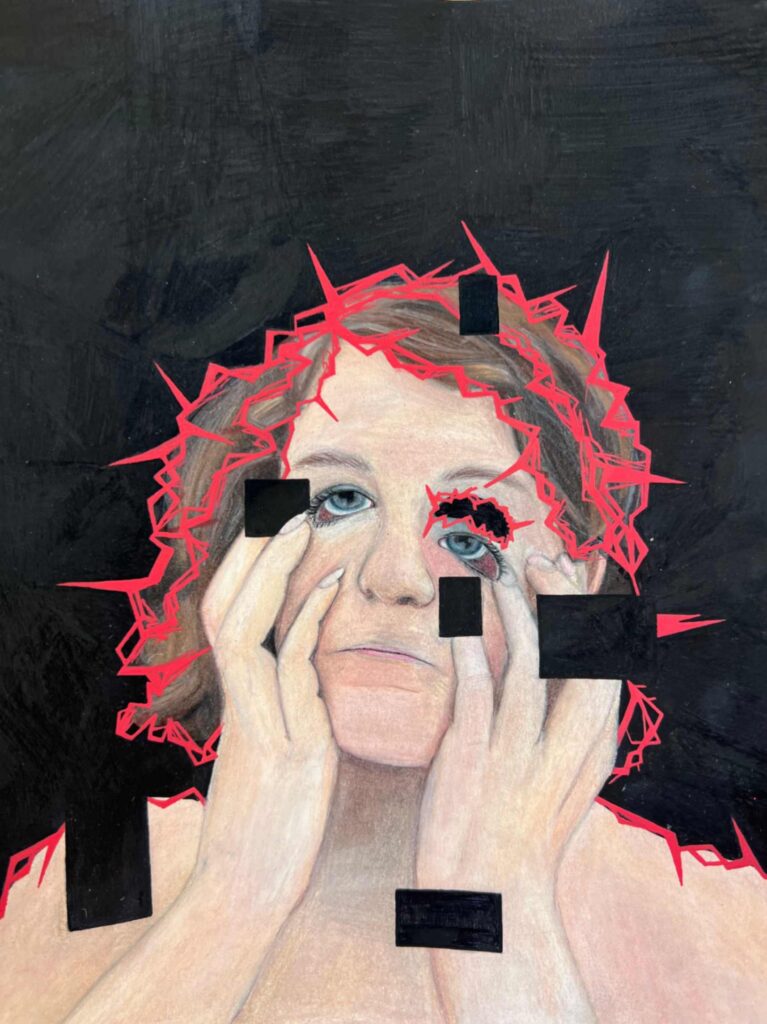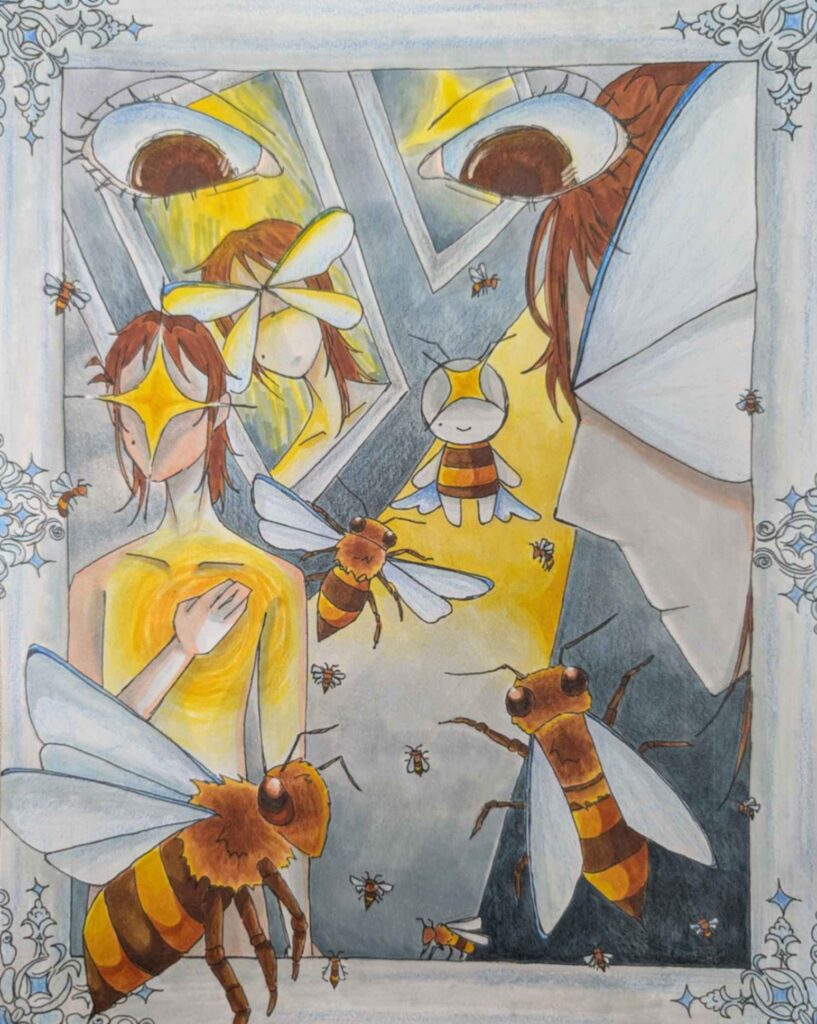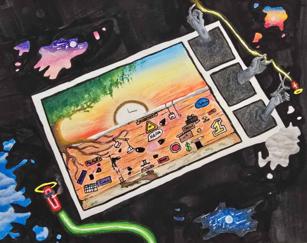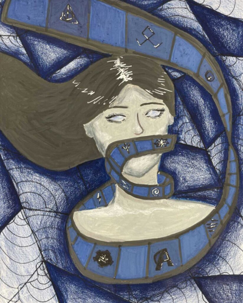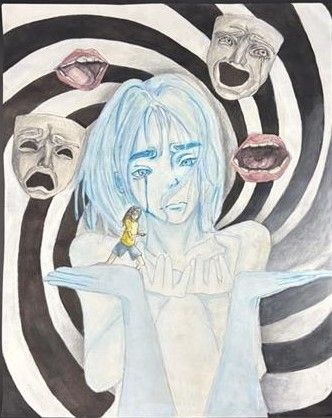 This art piece focuses on a character fighting her way toward the light as she works to overcome the struggle she is in. The glowing figure represents the girl’s inner mind, guiding her toward safety with the two sets of hands. The background demonstrates the complexity of trying to think clearly while overwhelmed. All these things lead to the drama masks and mouth, which show emotional tears, shouting, and the need for assistance.