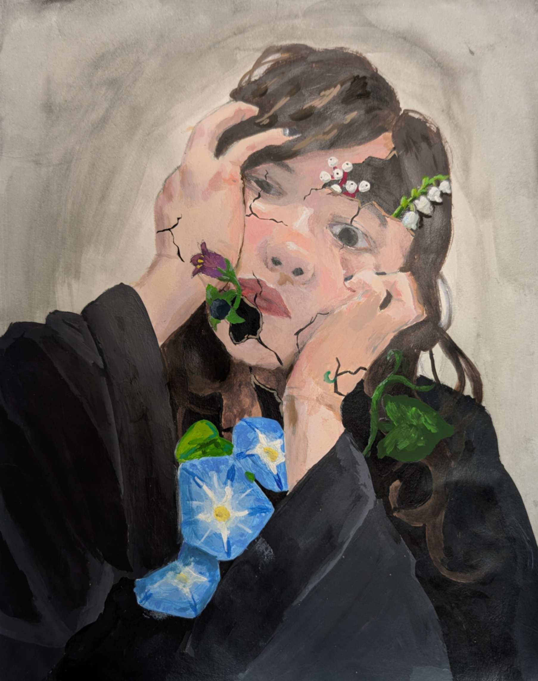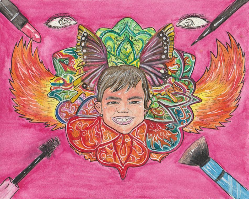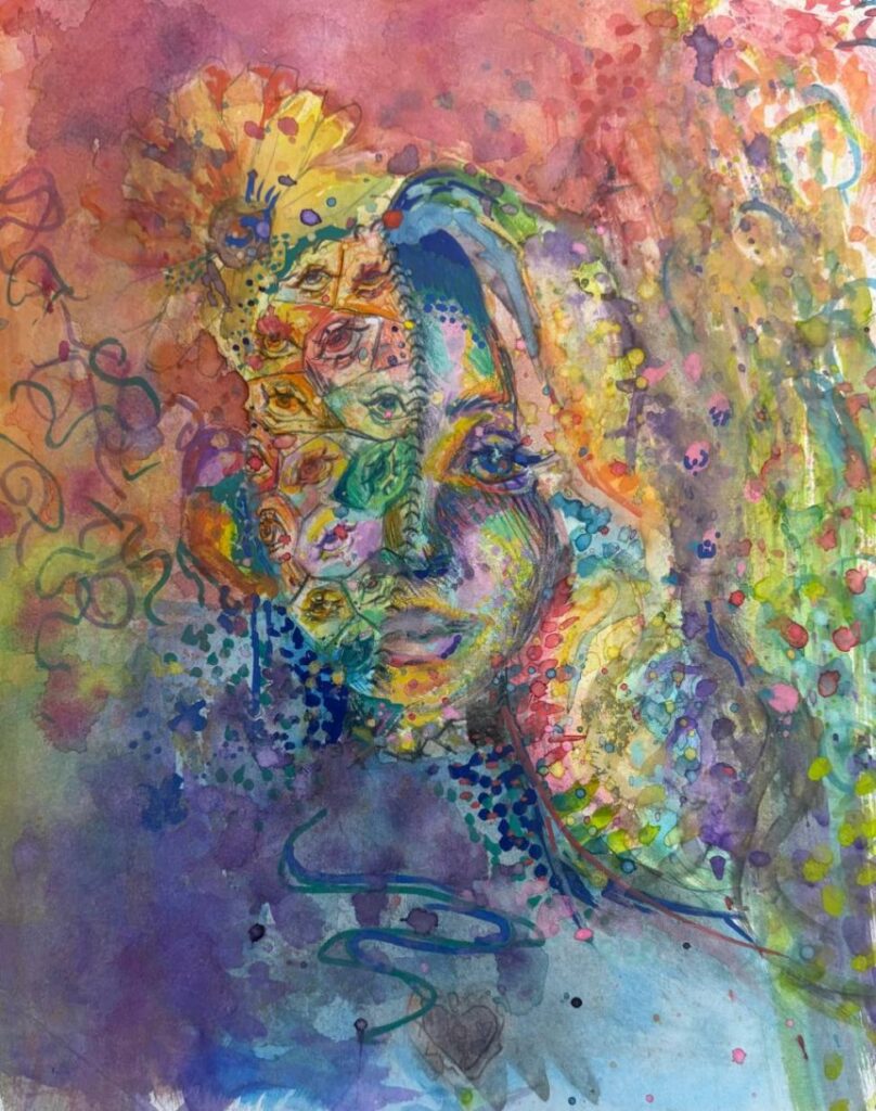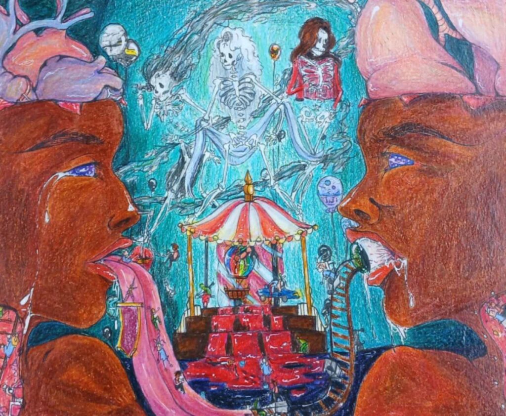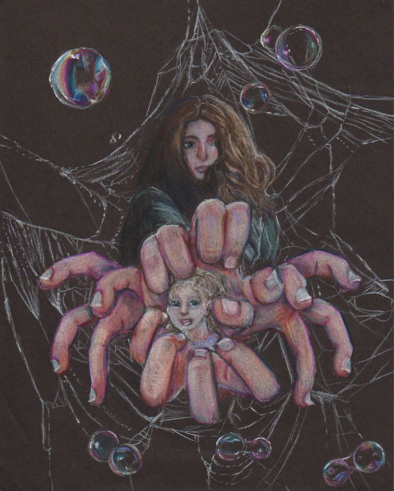 This art piece focuses on a character fighting her way toward the light as she works to overcome the struggle she is in. The glowing figure represents the girl’s inner mind, guiding her toward safety with the two sets of hands. The background demonstrates the complexity of trying to think clearly while overwhelmed. All these things lead to the drama masks and mouth, which show emotional tears, shouting, and the need for assistance.