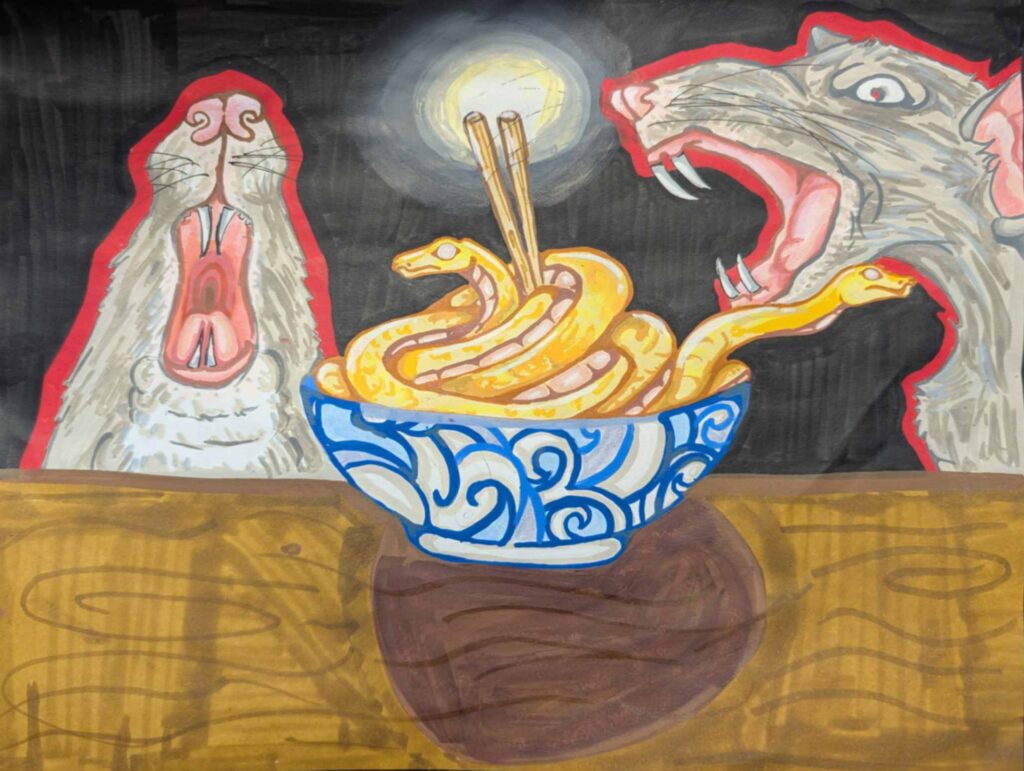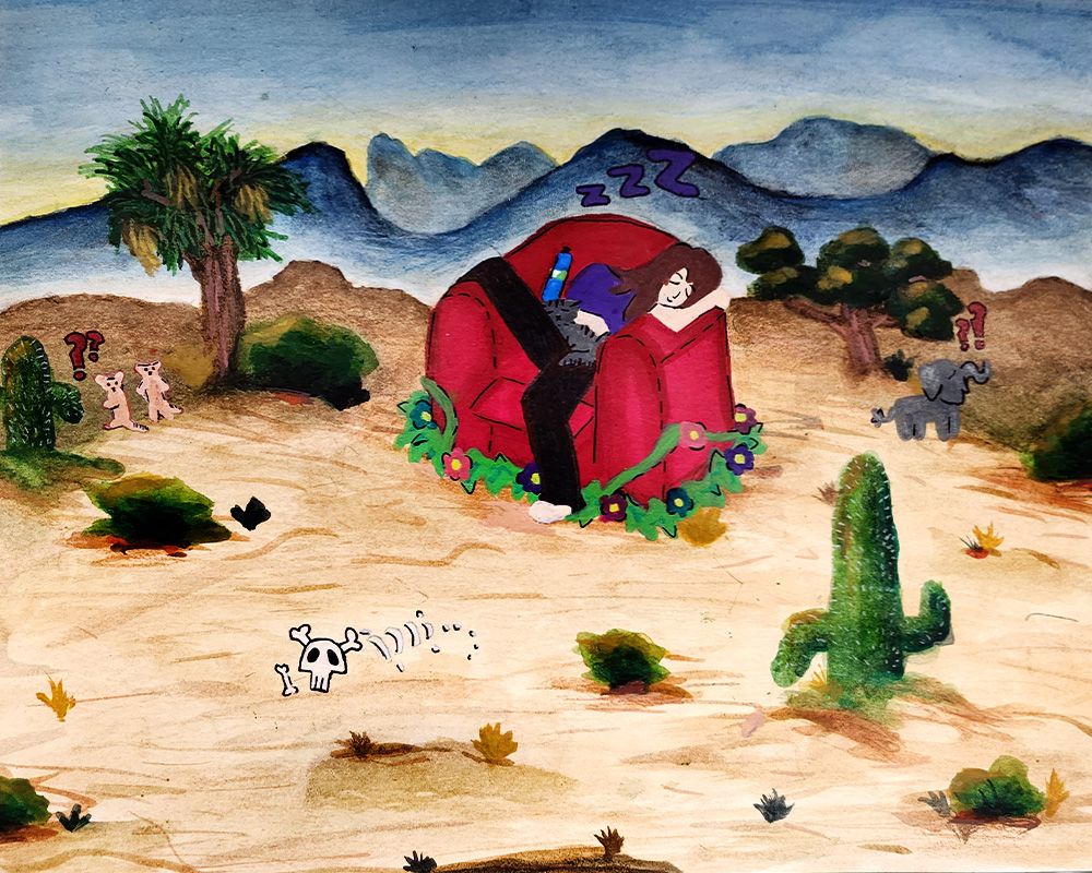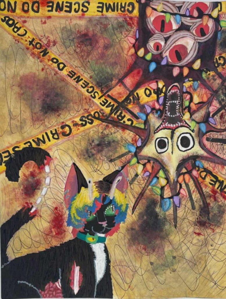 I was inspired by an online analog horror series by Doctor Nowhere when creating this piece while also placing myself as a self-insert cat snail hybrid to express the weird dreamlike state I find myself in constantly while awake and asleep. I draw influence from the subconscious mind and dream state like our Surrealism artist. Waking up mid dream, boarding the line of reality and fantasy, makes for a creative break that is expressive of my mind.