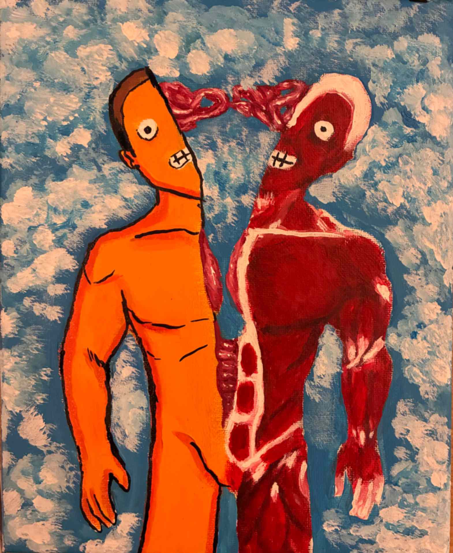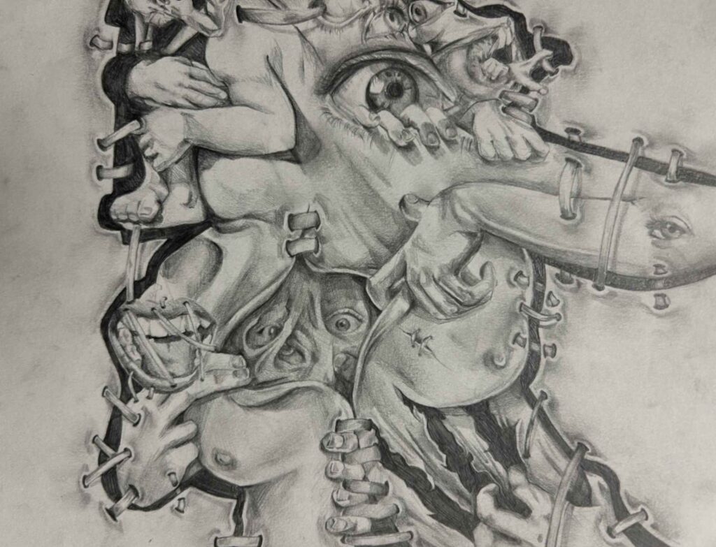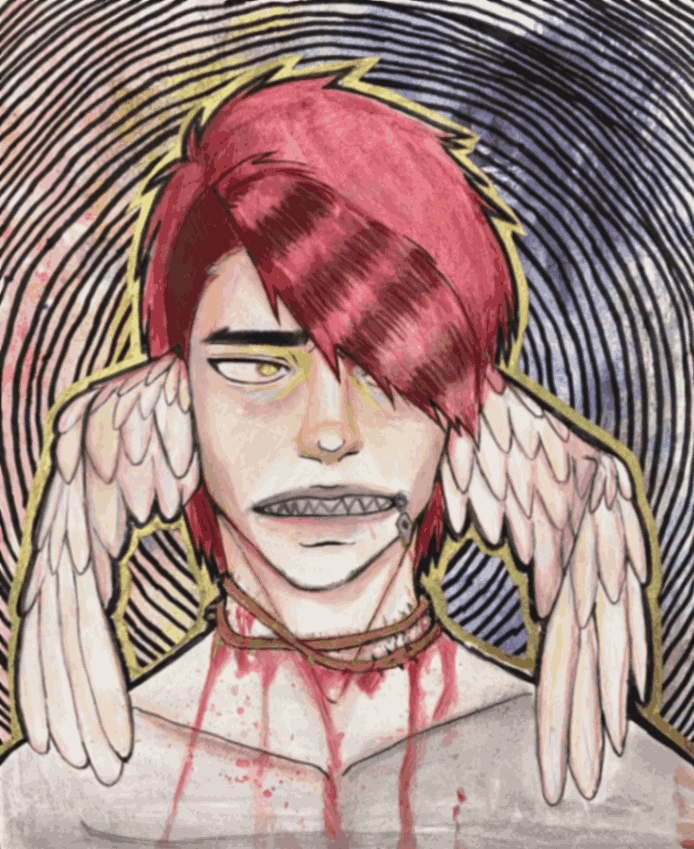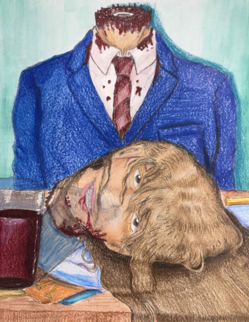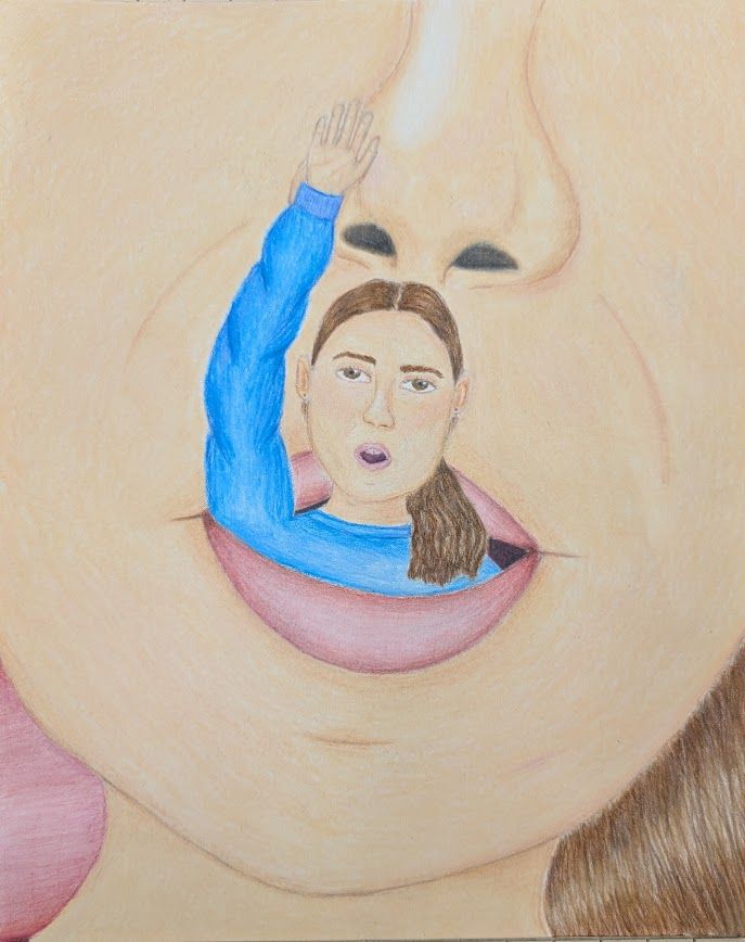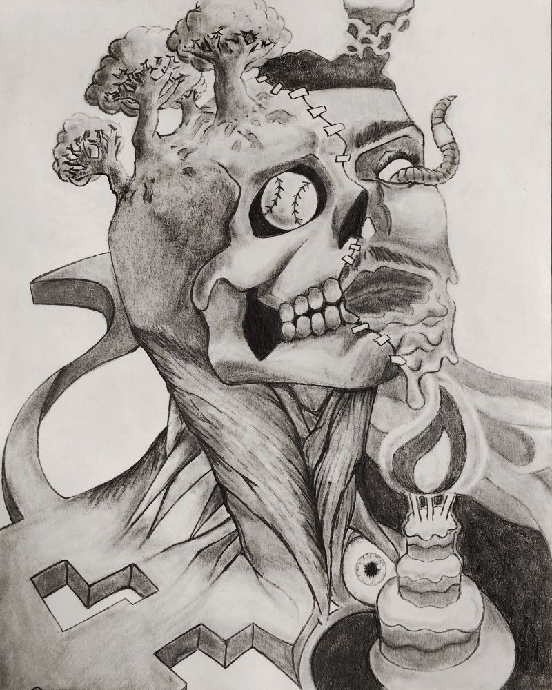 My inspiration for this piece was to dedicate and expose a part of my life that was eating away at who I was. I responded to the theme by making my piece uncomfortable visually, to give a sense of discomfort. I drew myself smiling to represent how delusional I was in this state of abnormality. The decapitation symbolizes taking parts (my head/face/personality) away from myself.