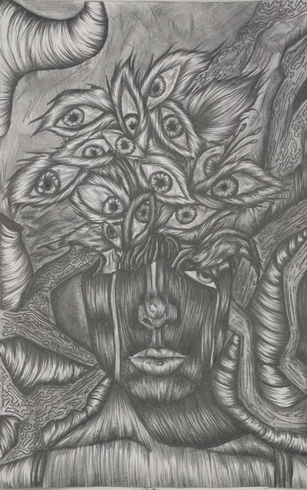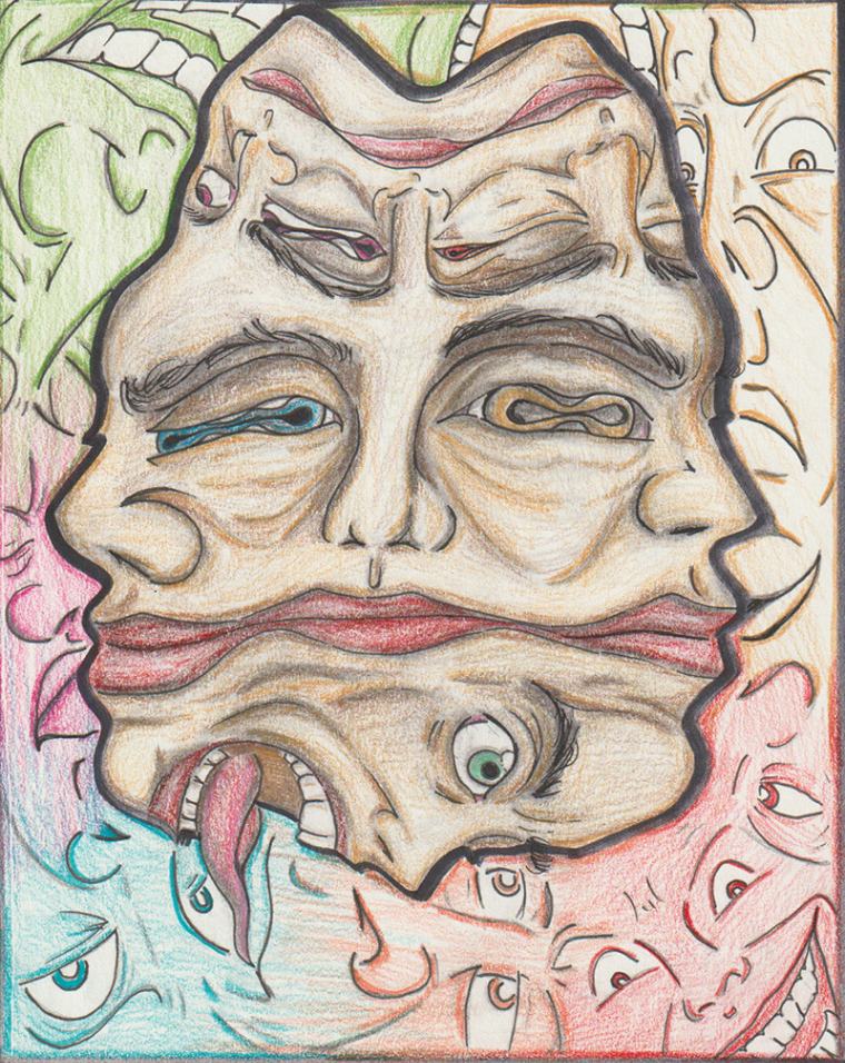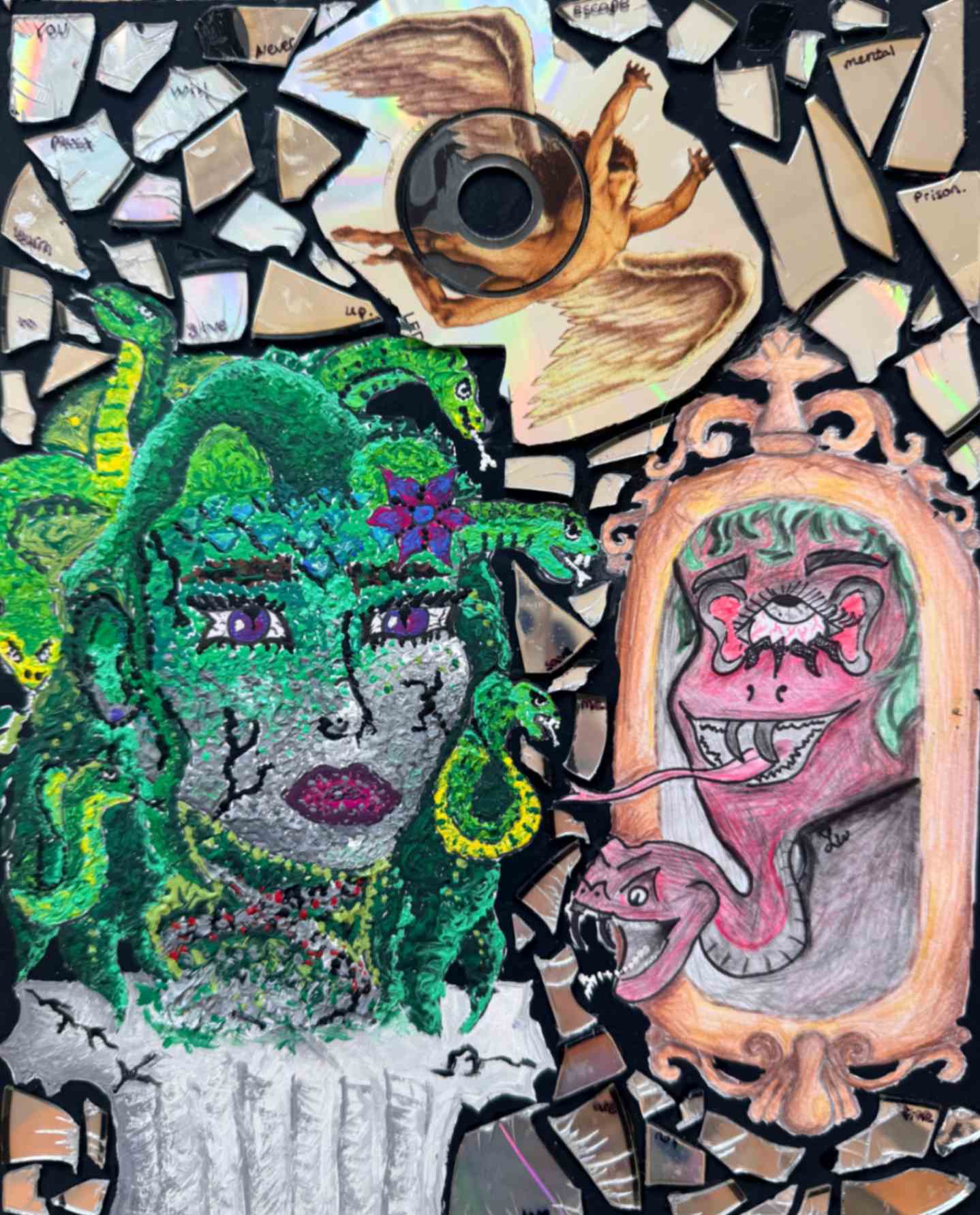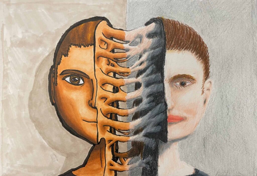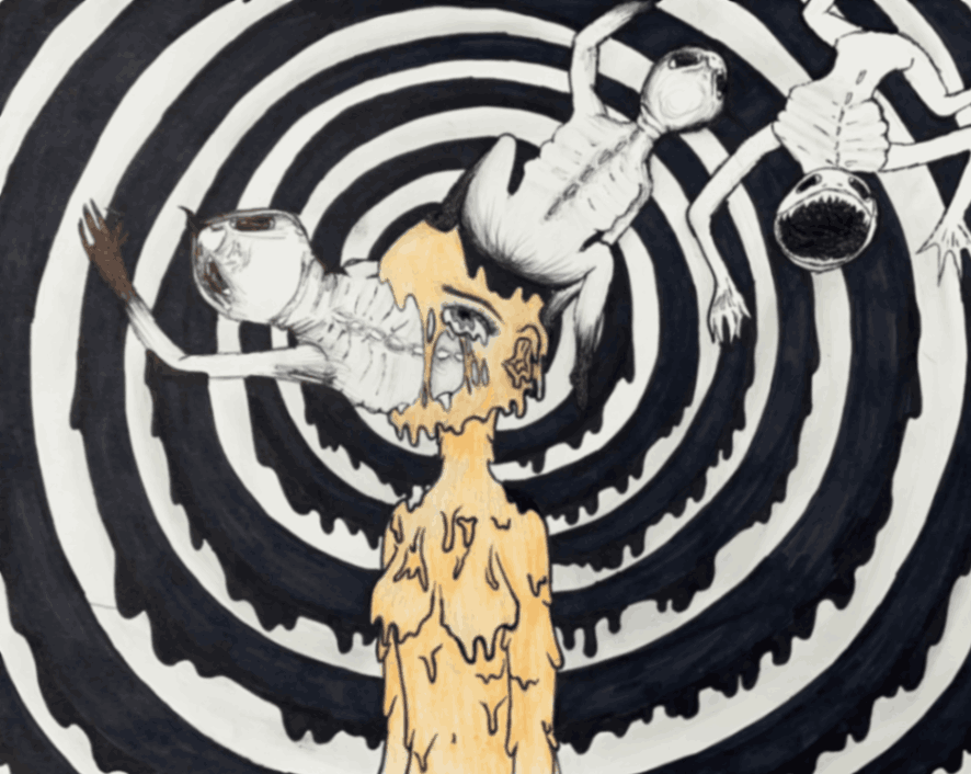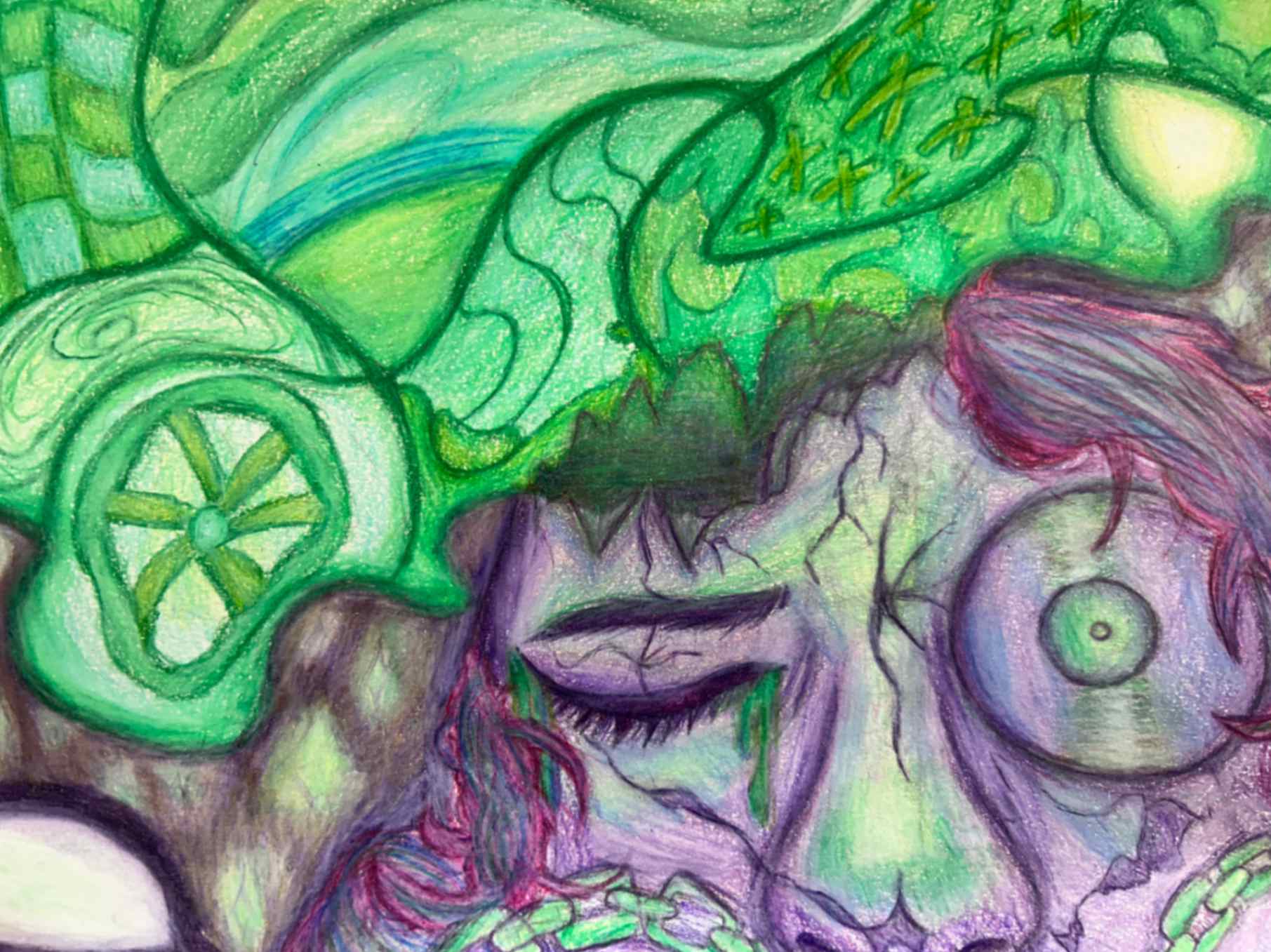 My inspiration for this piece was to dedicate and expose a part of my life that was eating away at who I was. I responded to the theme by making my piece uncomfortable visually, to give a sense of discomfort. I drew myself smiling to represent how delusional I was in this state of abnormality. The decapitation symbolizes taking parts (my head/face/personality) away from myself.