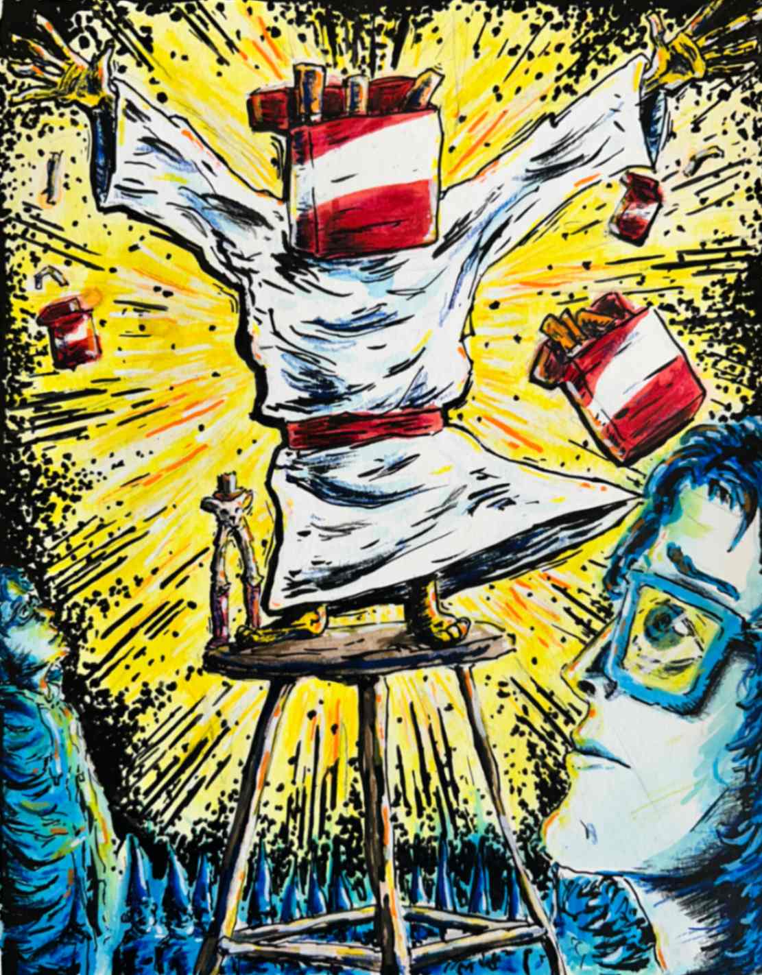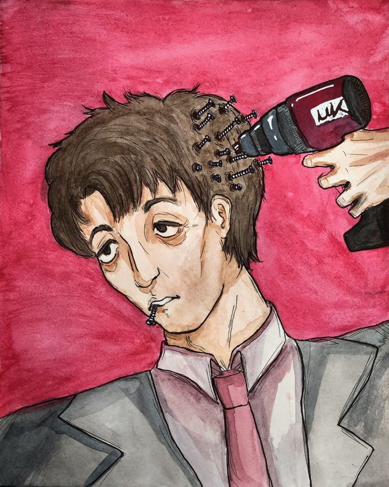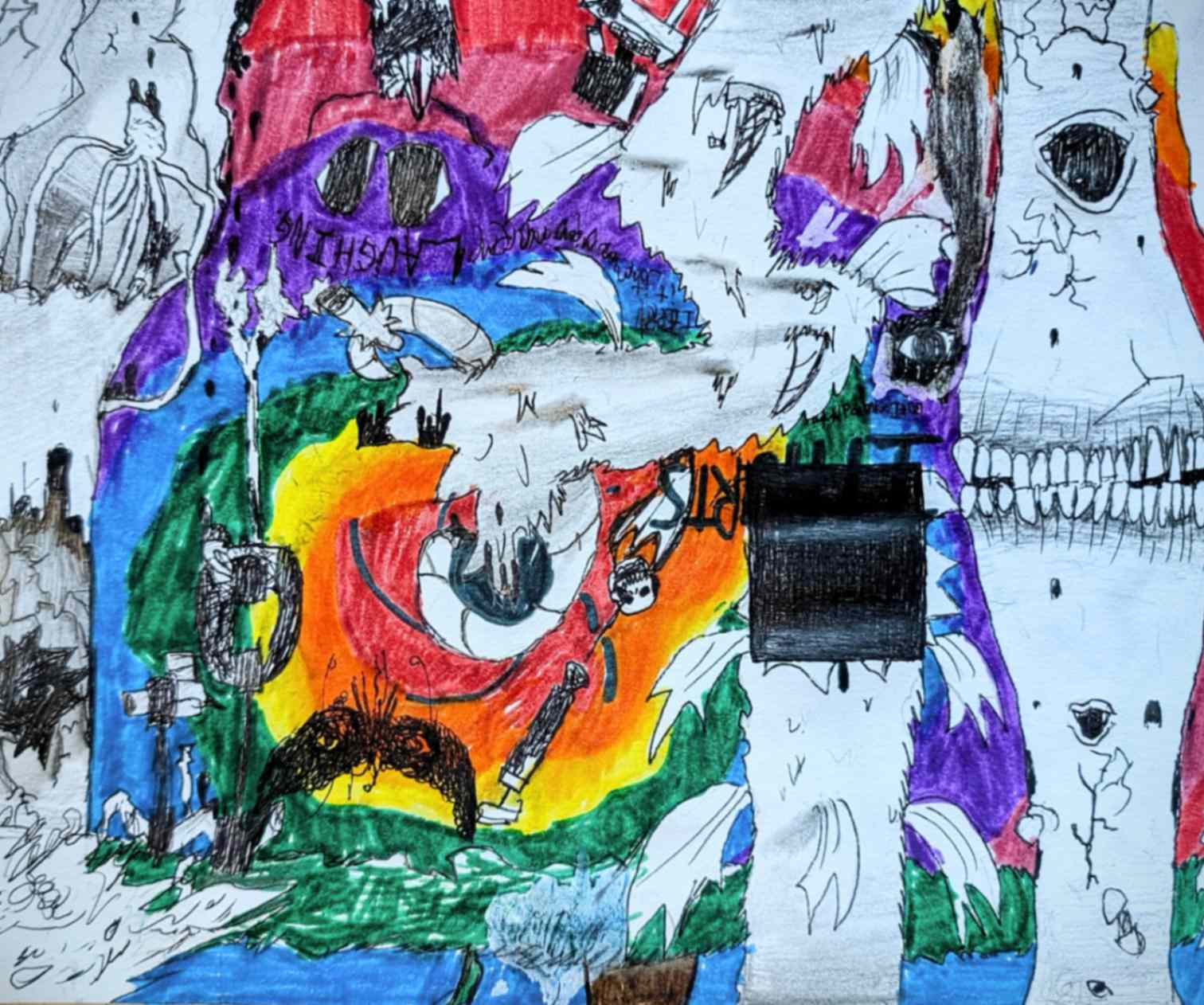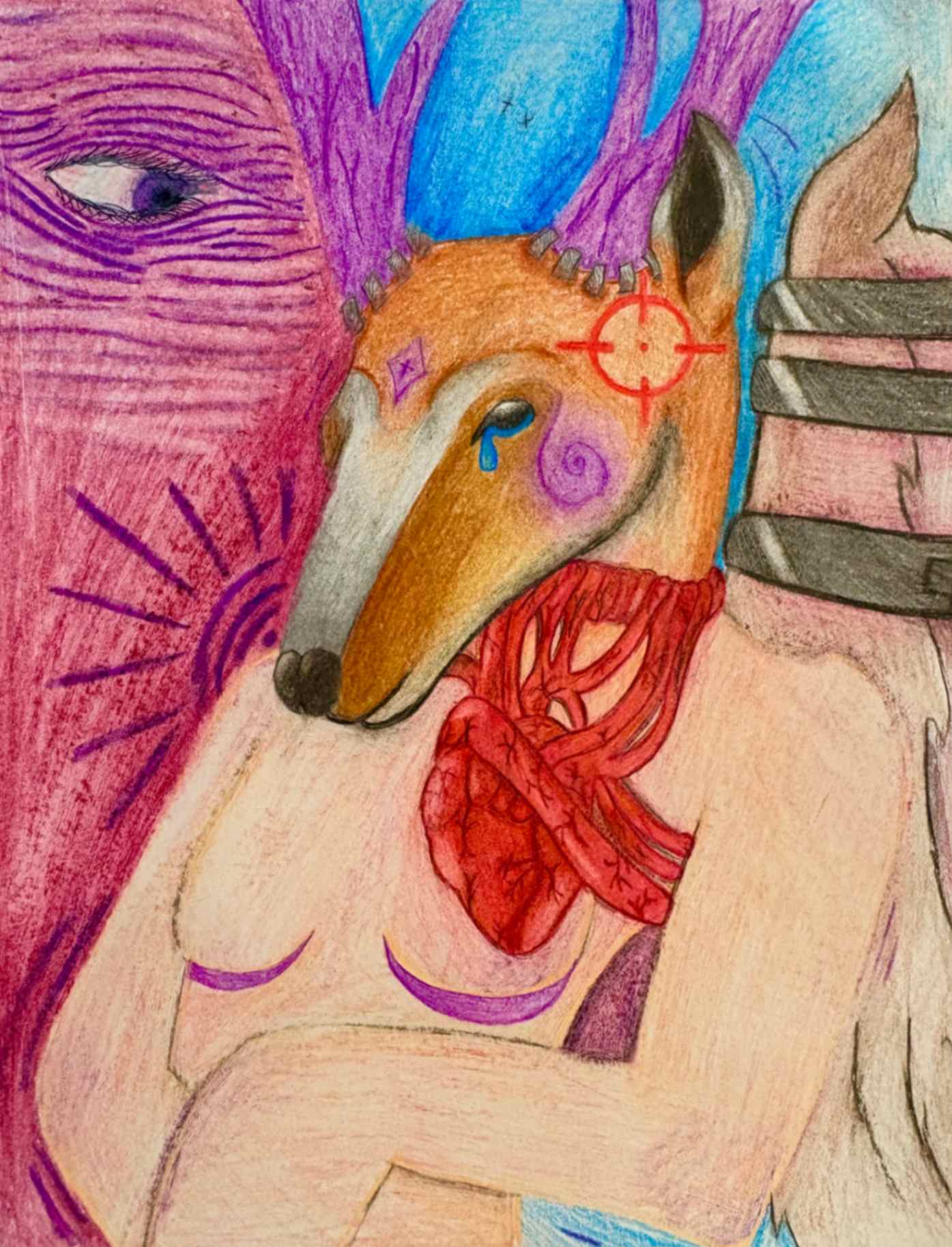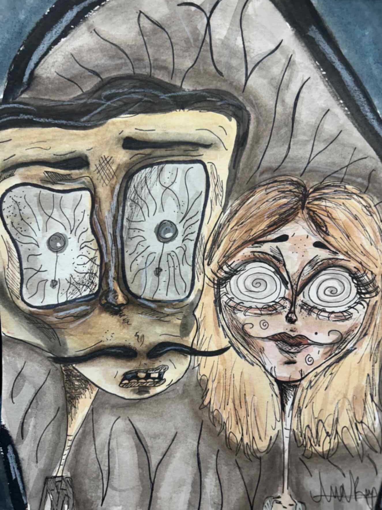 My inspiration for this piece was to dedicate and expose a part of my life that was eating away at who I was. I responded to the theme by making my piece uncomfortable visually, to give a sense of discomfort. I drew myself smiling to represent how delusional I was in this state of abnormality. The decapitation symbolizes taking parts (my head/face/personality) away from myself.