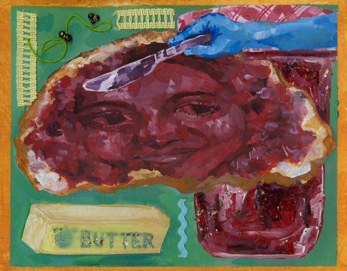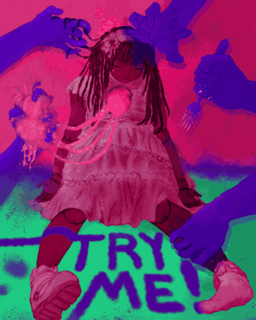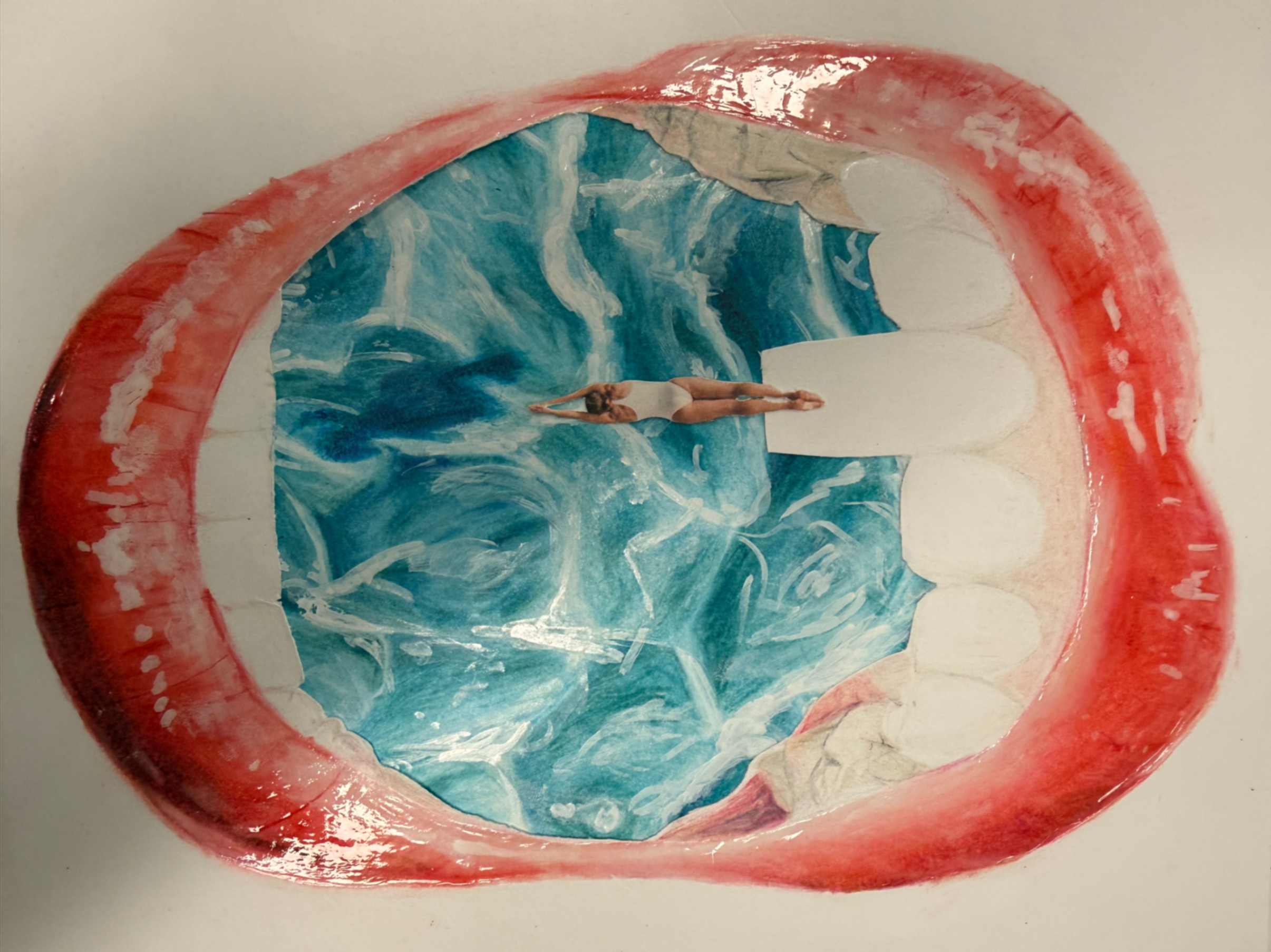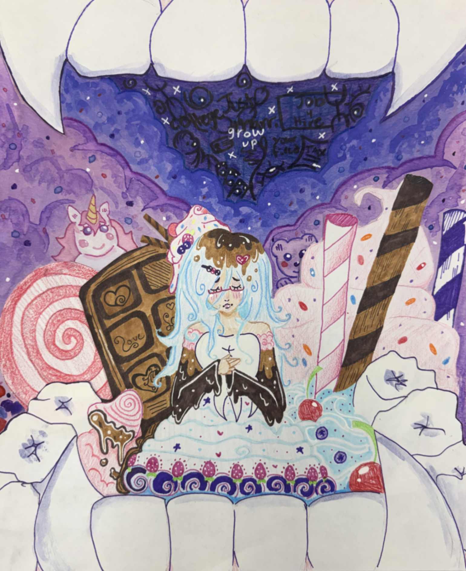 The inspiration for my piece represents things that I liked to indulge in as a child (such as sweets, clothes, toys) but still do today. These feelings are bittersweet (Agridulce) because I am no longer a little kid, but not yet ready to be an adult. The teeth in the piece symbolize wisdom teeth- teeth that many get taken out as a child but also have them as they transition into adulthood. They also represent the closing or an ending of one phase of life to another.