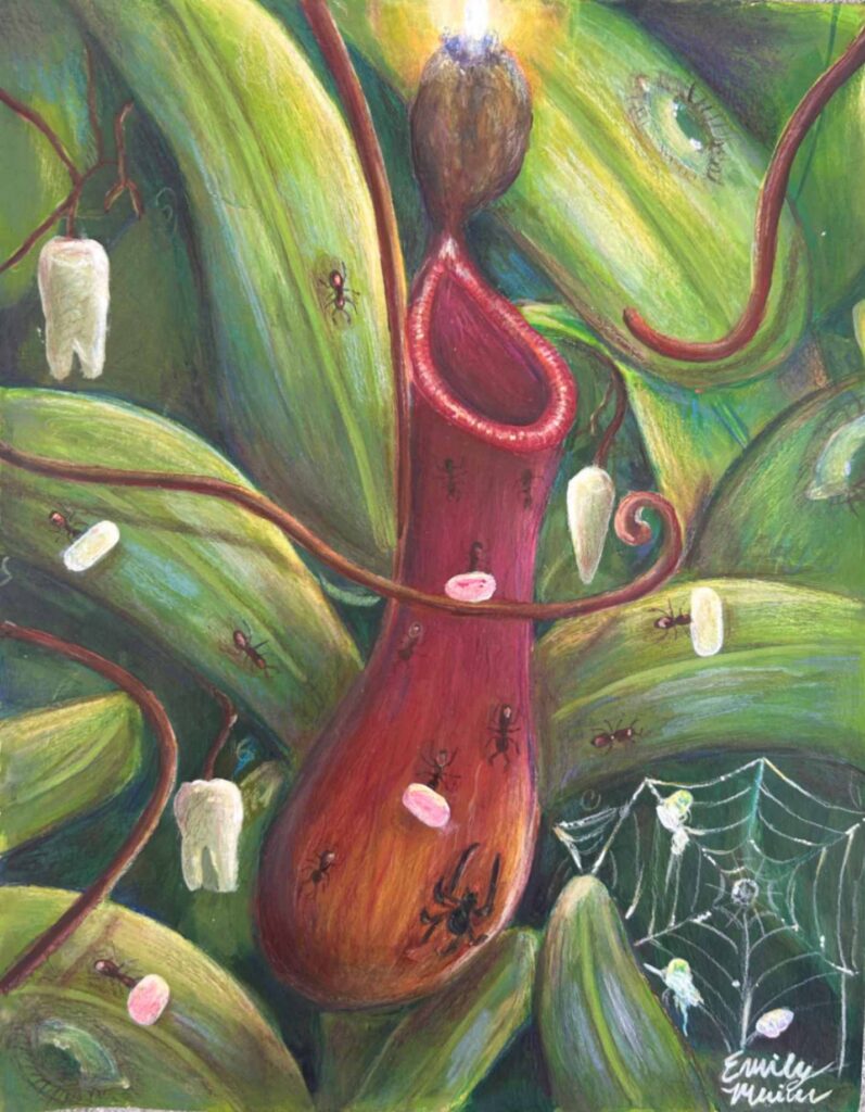The Pitcher plant, a plant that shows hope and is one I personally love, stands as a vessel to hold my longing hope for better health living with a chronic illness. However, as Dalí used in his works, ants can take away that hope and lead to sick days. But the daddy long legged spider, a French symbol of hope, is bringing the hope back and ensuring that better days may come.