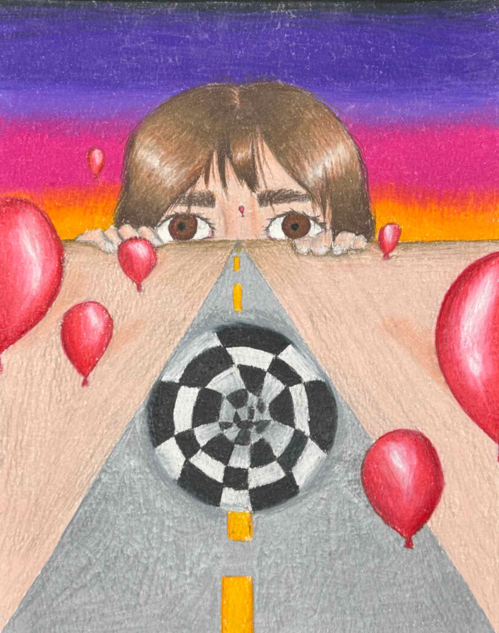 This art represents the doubt of not finding the end of the path and redoing things over and over again just to not move forward with things which is is why there’s a bigger, intimidating version of me blocking my path like an obstacle in which the version of me which is walking down the path is doubting and regretting the attempt to move forward since she’s unable to find the relief of the end of the path.