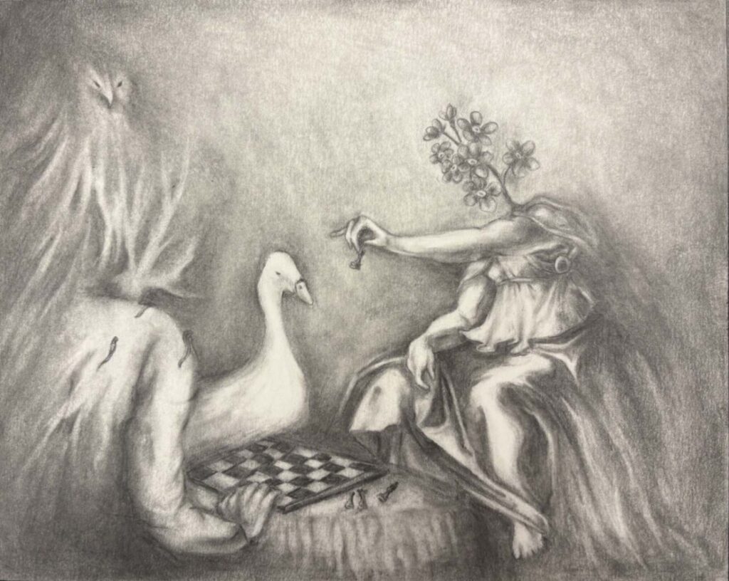 This piece represents the toll of stress. Through setting and lack of color, there is a place of comfort that is torn to pieces by your own doing. The is room overridden by symbols of obsession and sadness, with a small ray of “hope” filtering through the window. Warped floorboards represent wavering sense of self and hesitancy. Open drawers and the white roses highlight broken innocence and a gateway to the subconscious.