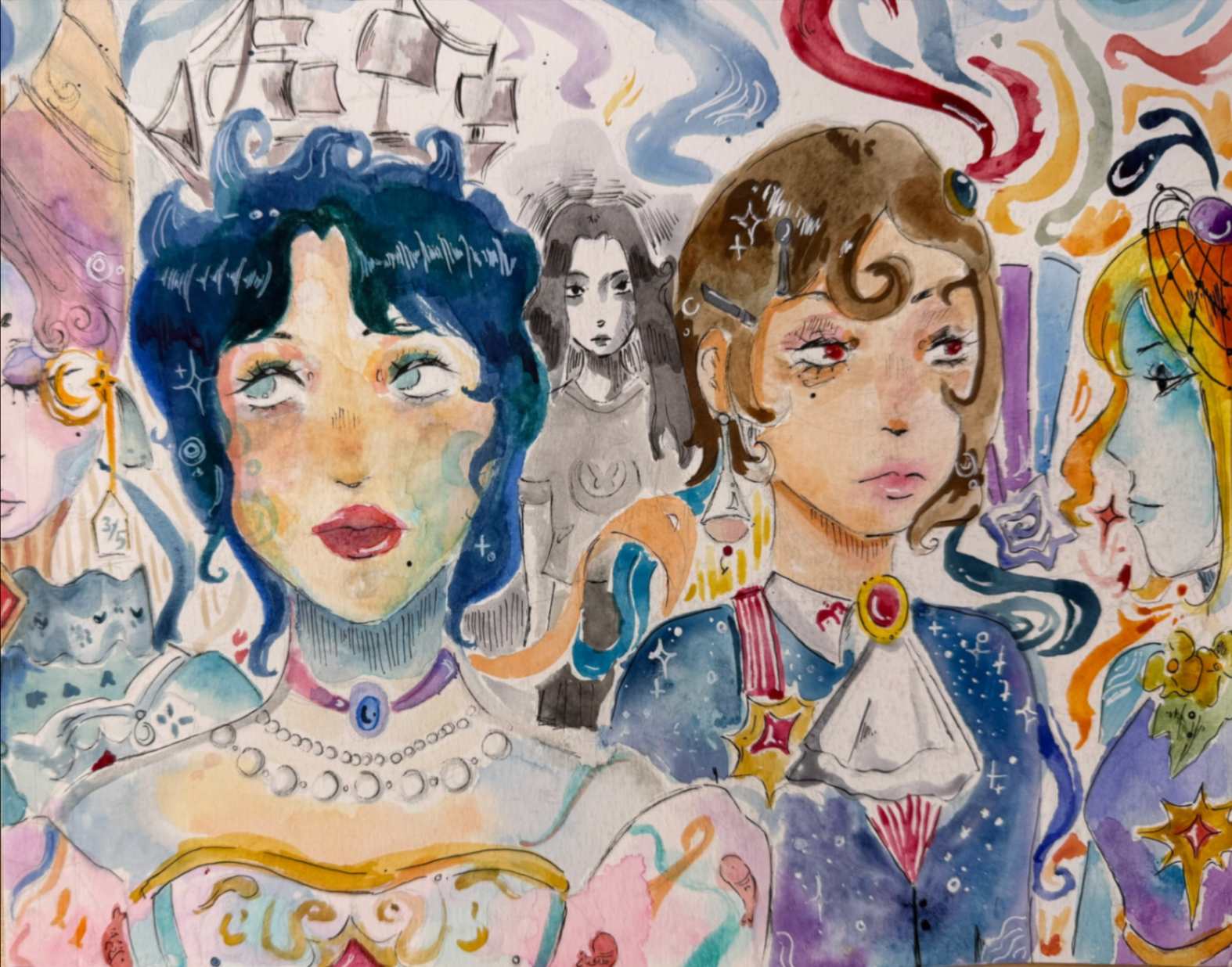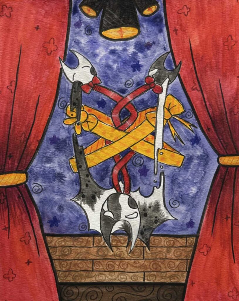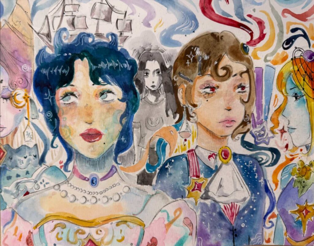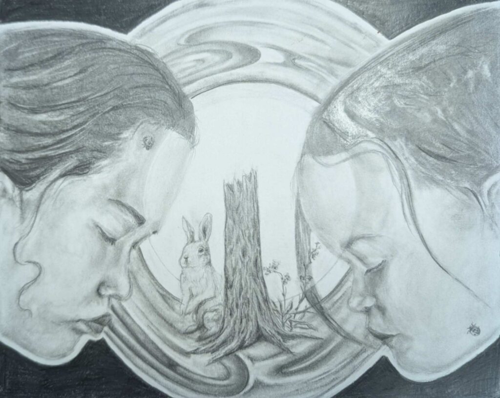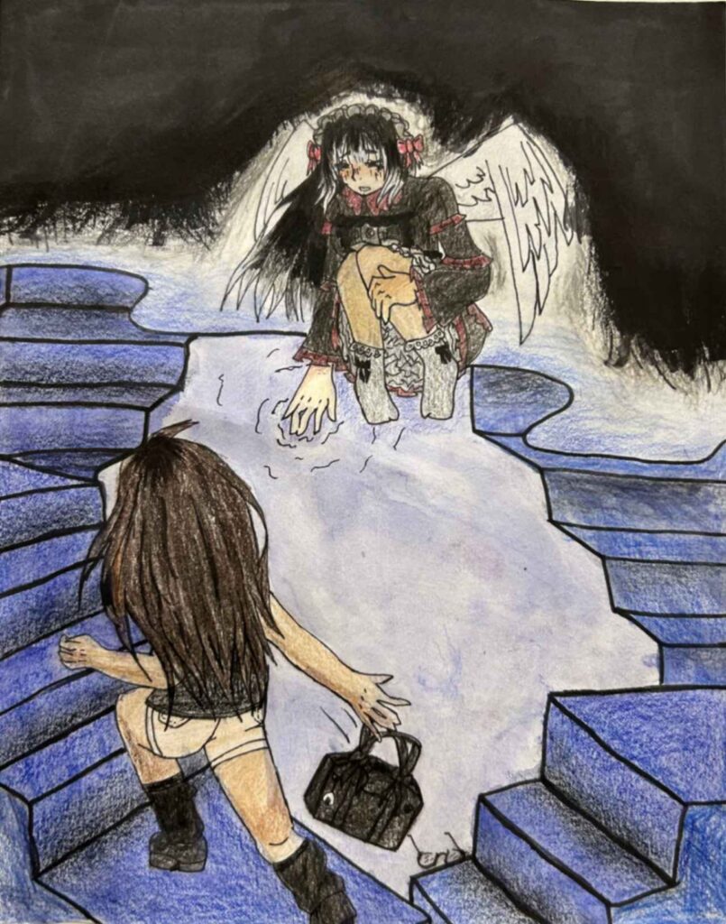 I really wanted for my art to show a piece of me that I can only really show within my drawings and to also show the difference between my self and what I’d wish to be more like with the two characters, and the stairs as the body of water was so that I can show the barrier between the two while also representing life and how odd or complex it can be. As for the void part of the art work, it’s completely up for interpretation for everyone.