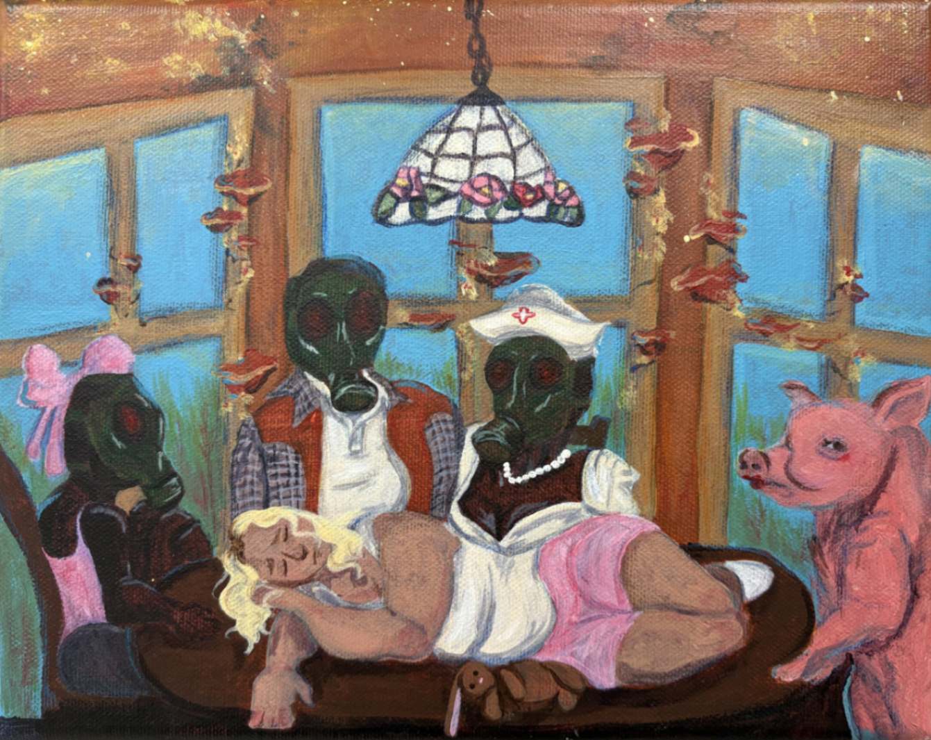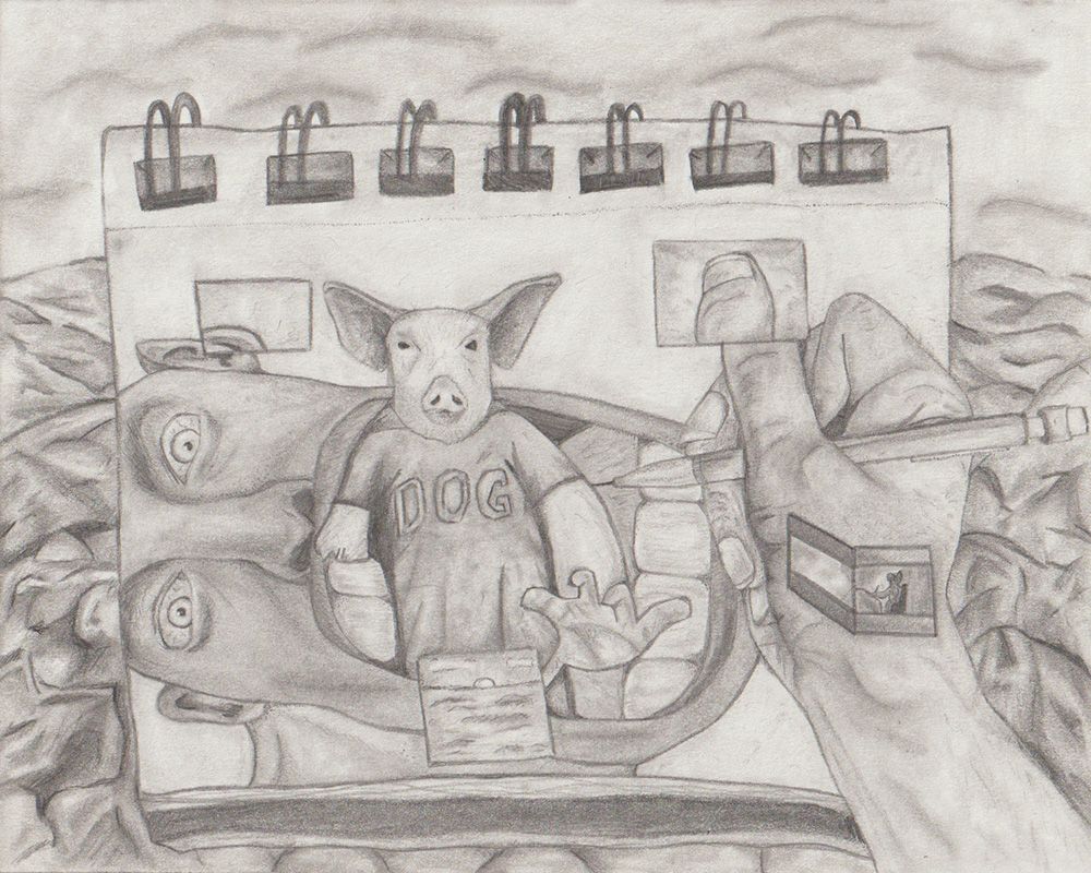 I applied my feelings about my complicated family dynamic to a post-apocalyptic world, rooted in my deep love for history. Like Dalí would explore his identity in his work, I explored my own by swapping places with the roasted pig at dinner with my perfect nuclear family. The displacement of the pig at the dinner table— representative of how I feel displaced in my own life and in a reality that isn’t quite right.