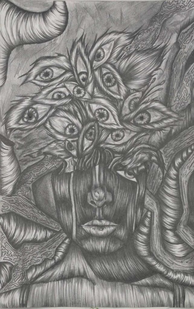 A surreal artwork where a head looks as if it were a flowerpot with leaves and vines overgrow it, representing personal growth with a chaotic background. The lack of color shows that there is more self-improvement to come.