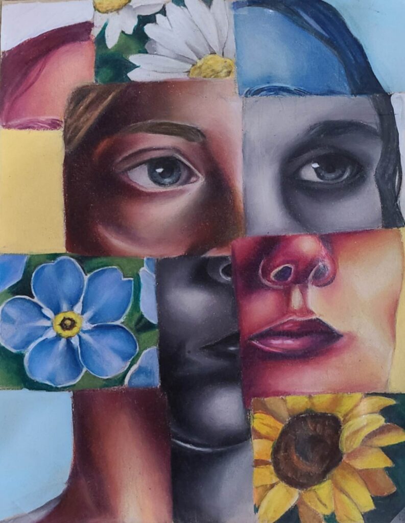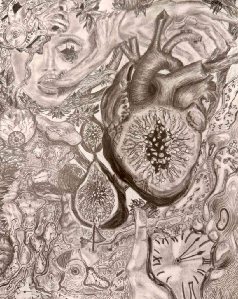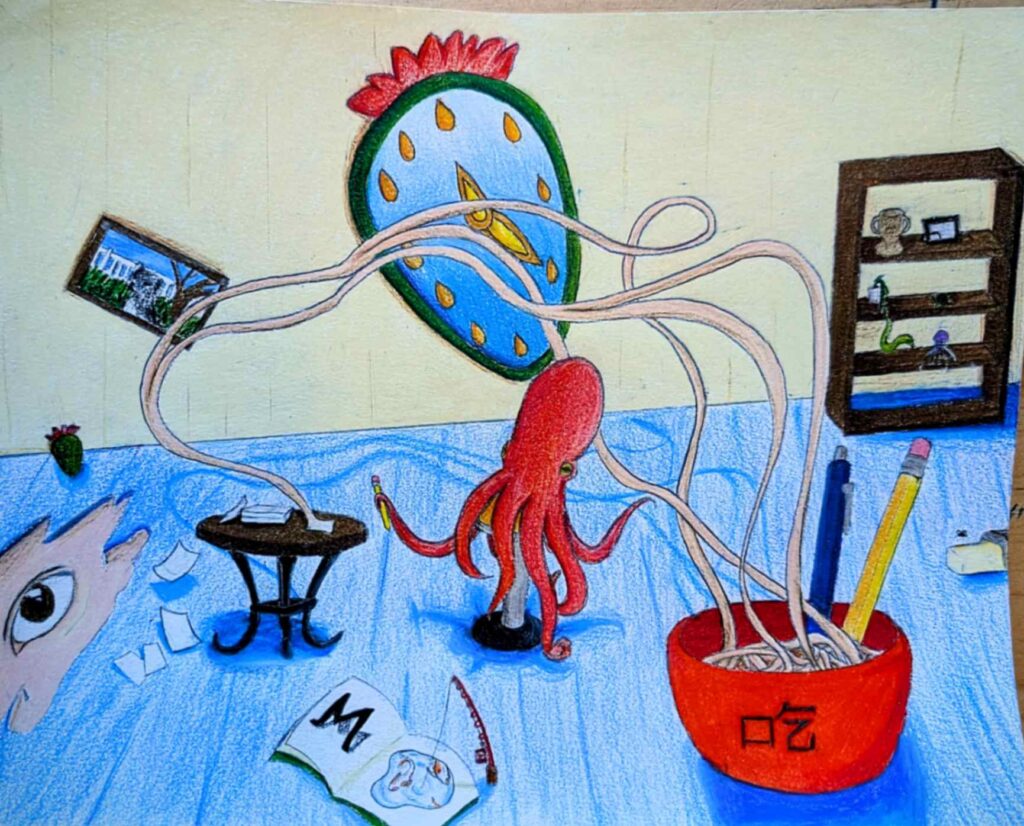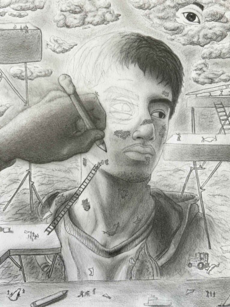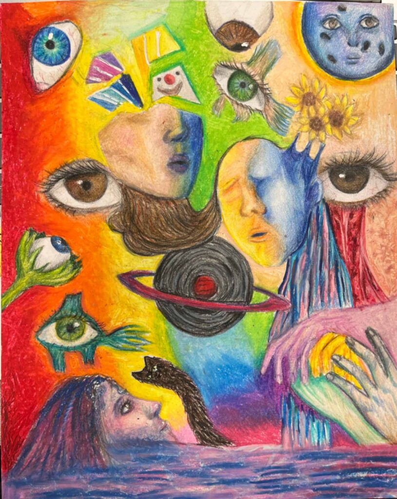 My piece Dalí and Me was inspired by how artists from the past, especially Salvador Dalí, shape the imagination of young artists today. I responded to the theme of the surreal self by blending portraiture with dreamlike symbolism. Using distortion and unexpected scale, I explored identity as fluid and strange, honoring Dalí’s ability to turn the familiar into something unforgettable.