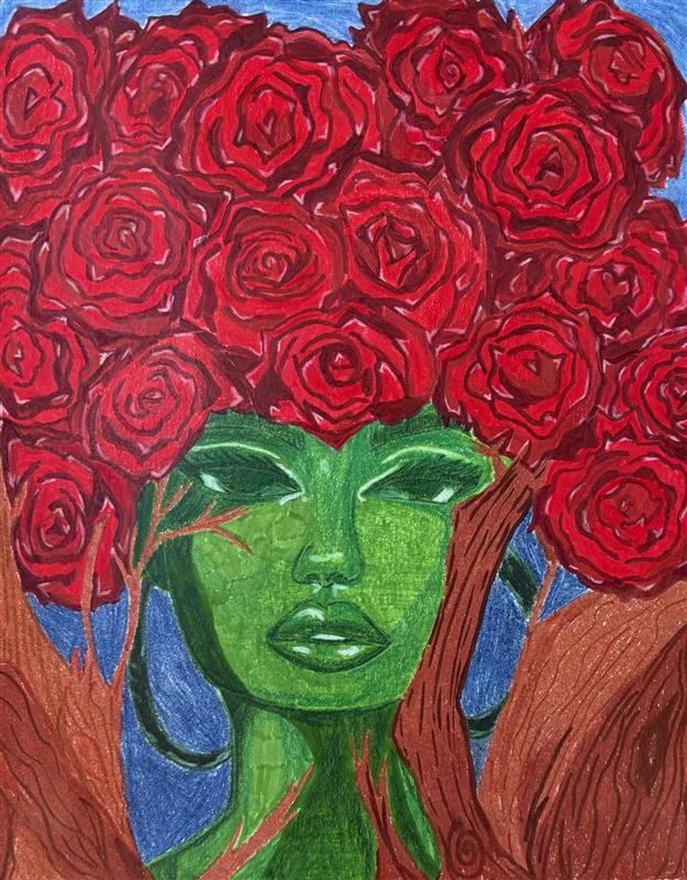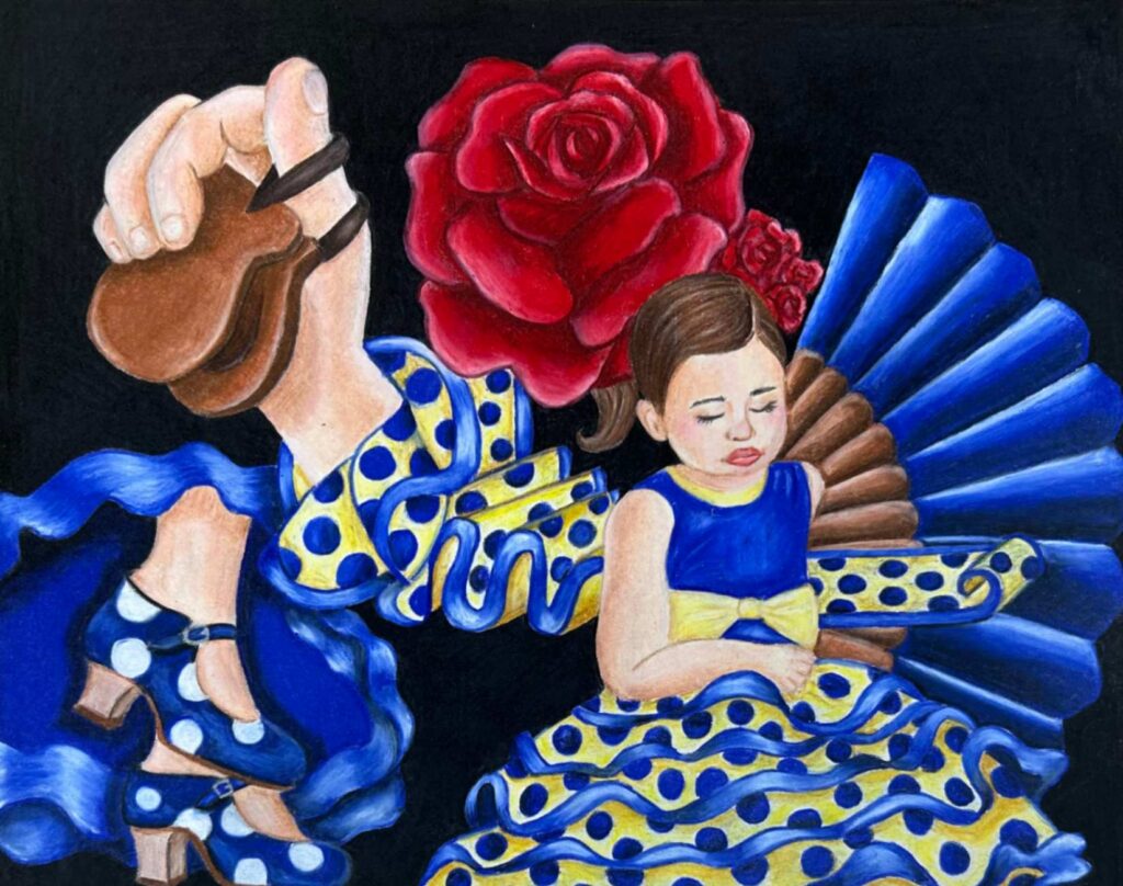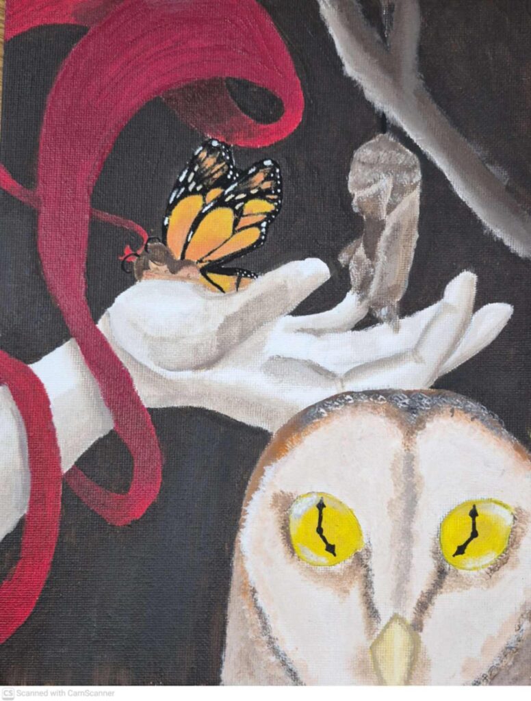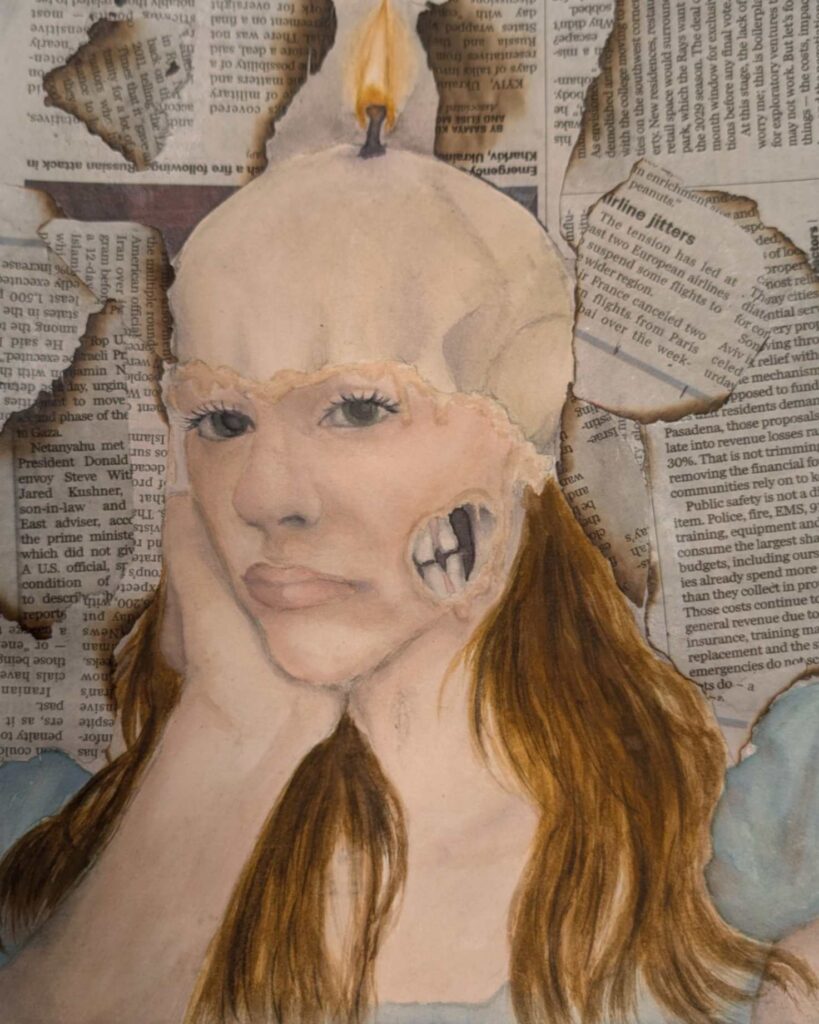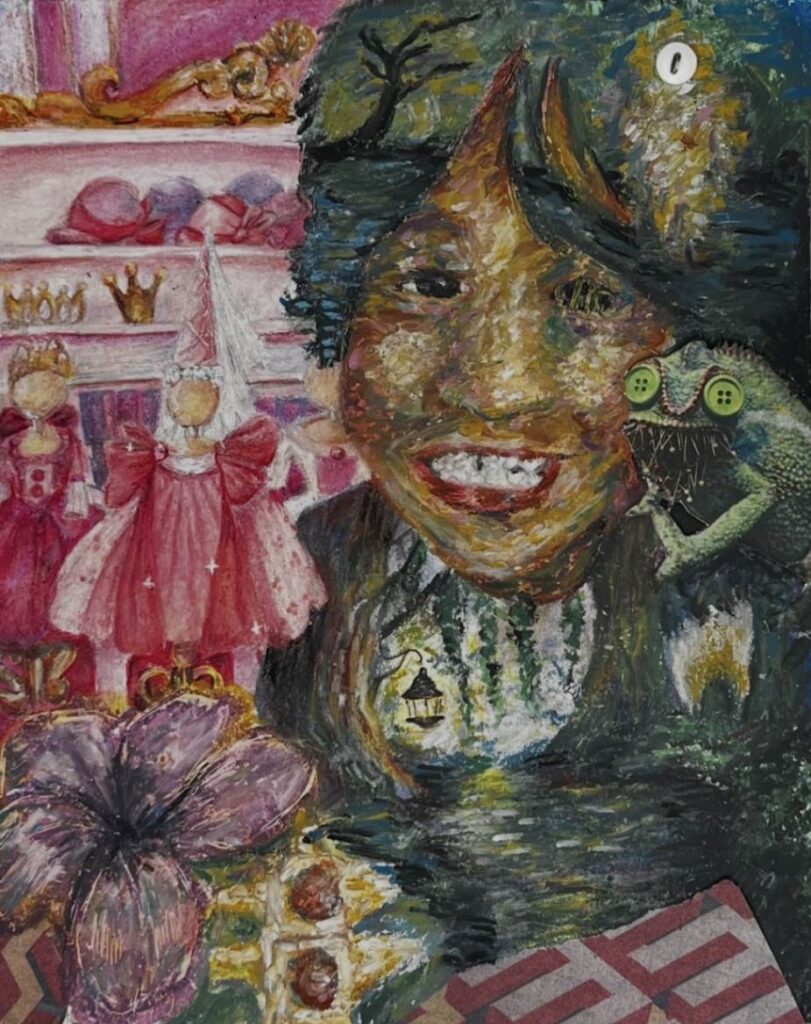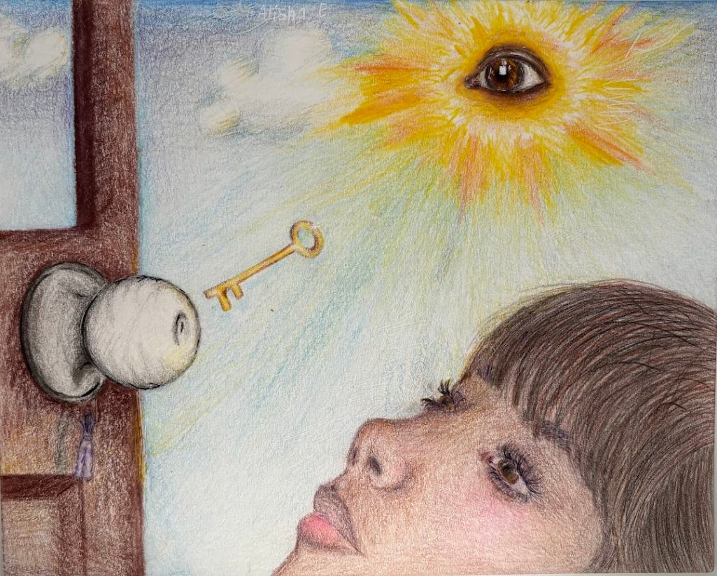 My piece Dalí and Me was inspired by how artists from the past, especially Salvador Dalí, shape the imagination of young artists today. I responded to the theme of the surreal self by blending portraiture with dreamlike symbolism. Using distortion and unexpected scale, I explored identity as fluid and strange, honoring Dalí’s ability to turn the familiar into something unforgettable.