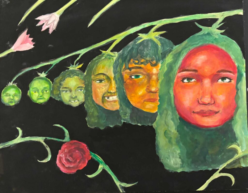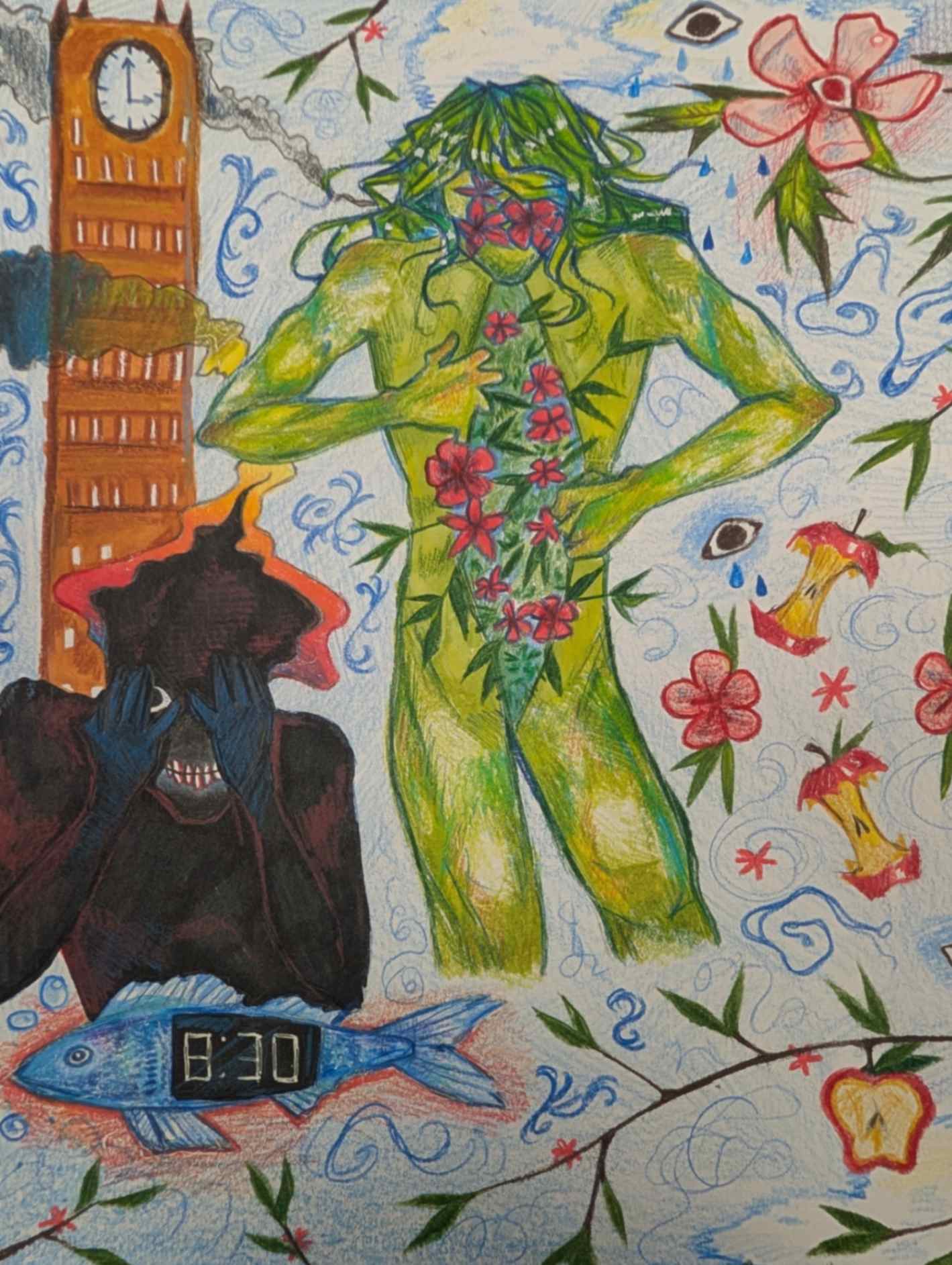This piece represents how time can’t be reversed. The different kinds of clocks in it represent time. The nature theme represents childhood and personal growth. The black figure and eyes around the piece symbolize fear for the future and change. The fresh and eaten apples show how things change over time. New things can be scary and unwelcome, so I showed my thoughts on it with this artwork.