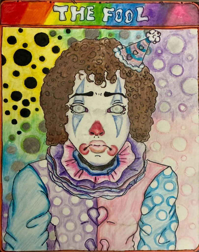 My inspiration is a character I identify with, Razzle and Dazzle. Using Dalí’s idea of double images, I’ve created a scene of subconscious duality set on the stage of life. It shows a way to find balance between the best of memories and today’s realities. What can make you laugh can also make you cry.