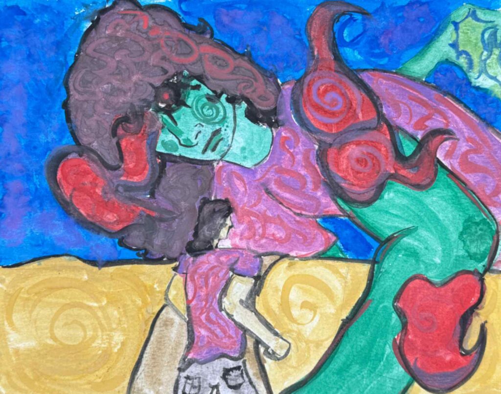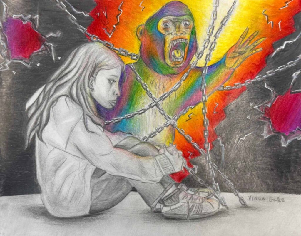 In this piece, I draw myself scrunched up and sad as a vibrant monkey pushes out from within me. The dark, heavy background contrasts with the monkey’s bright colors and movement. The monkey represents my true personality: playful, expressive, and full of energy, which I often hide at school out of fear of being judged or seen as “too much.” My curled posture shows suppression, while the monkey emerging symbolizes my inner struggle and strong desire to be seen and fully express who I am.
