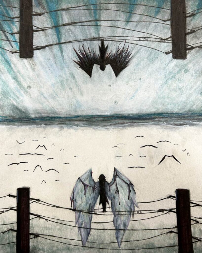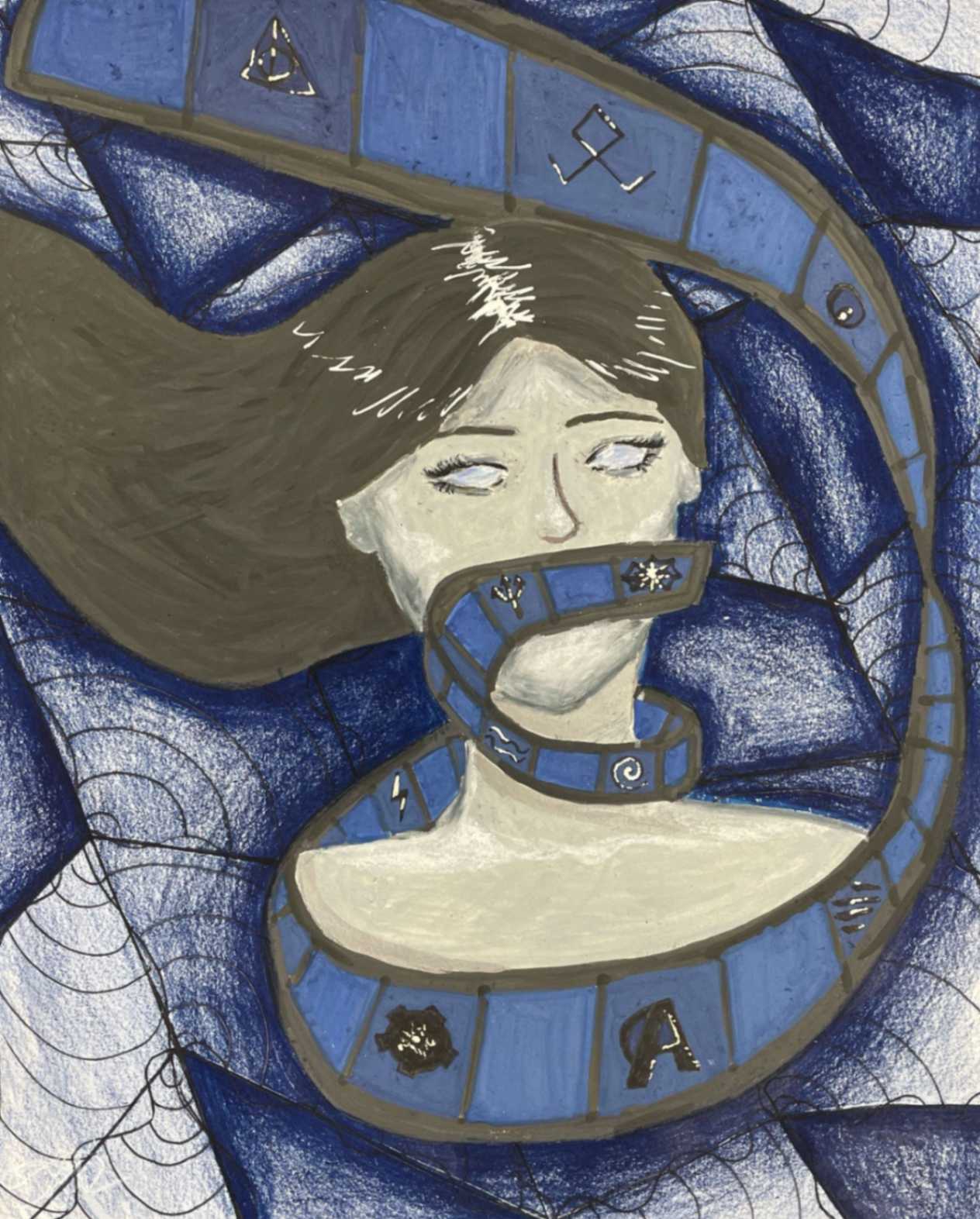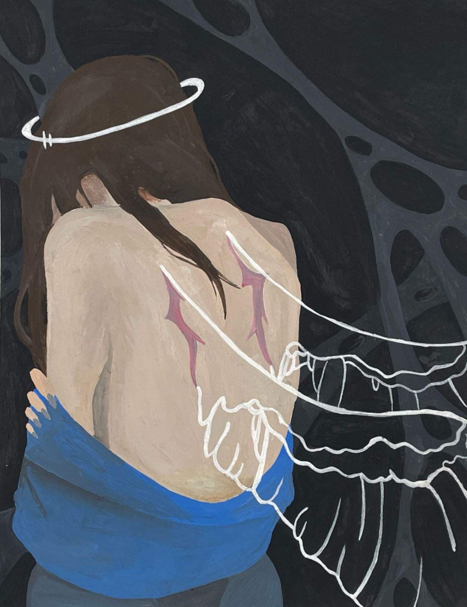 My artwork uses a blend of realism and abstract patterns to portray an angelic figure. She is expected to be perfect, yet she carries her own burdens and pains, expressed by her pale skin, hunched form and the scars on her back where wings emerge from. Ultramarine fabric embraces her, contrasting the dark webbing surrounding her that begs her to lose herself in the void, escaping the idealistic expectations placed upon her.