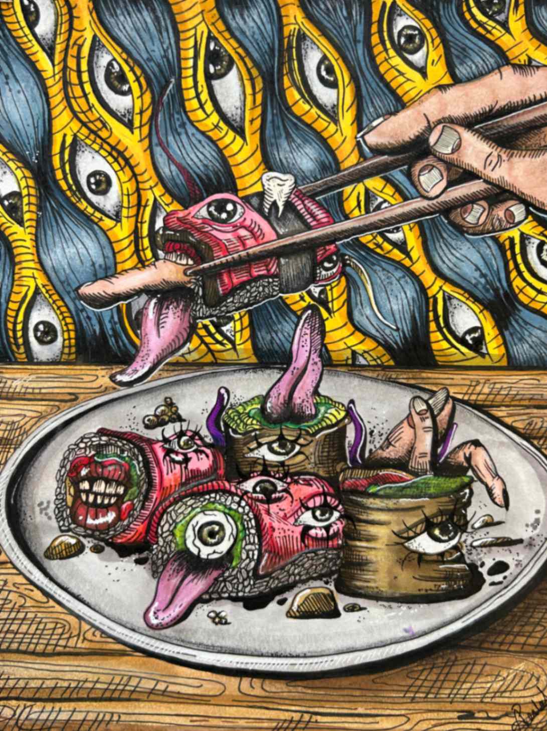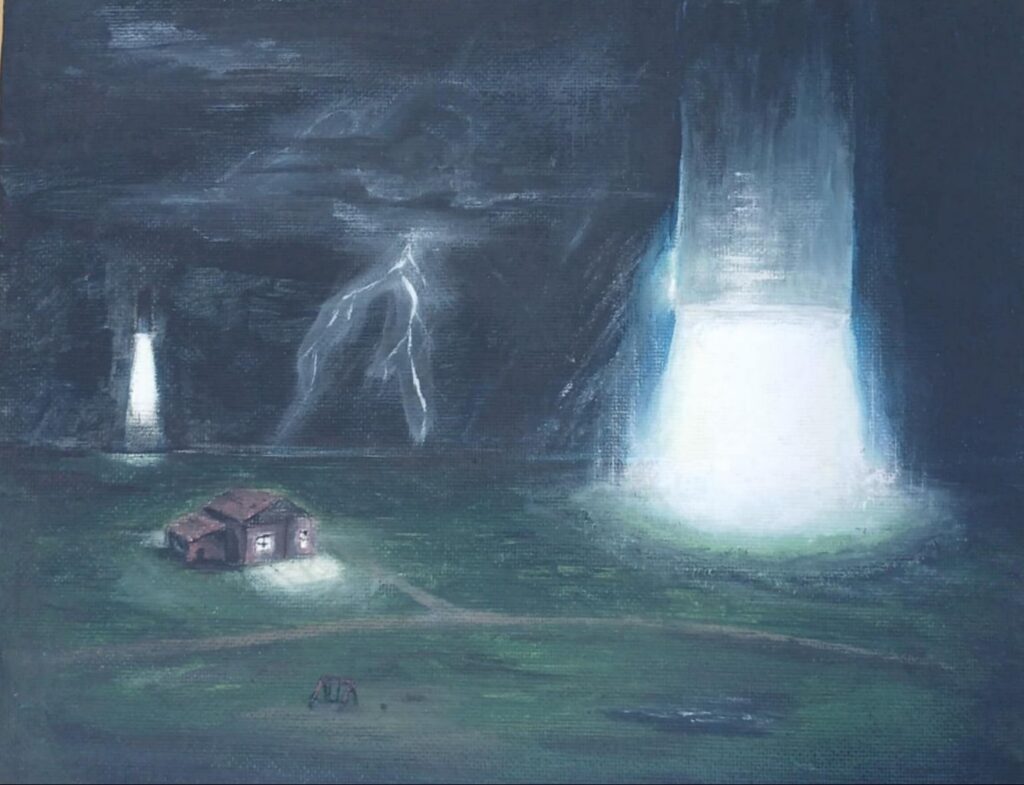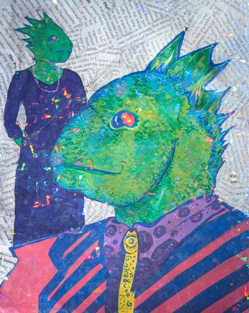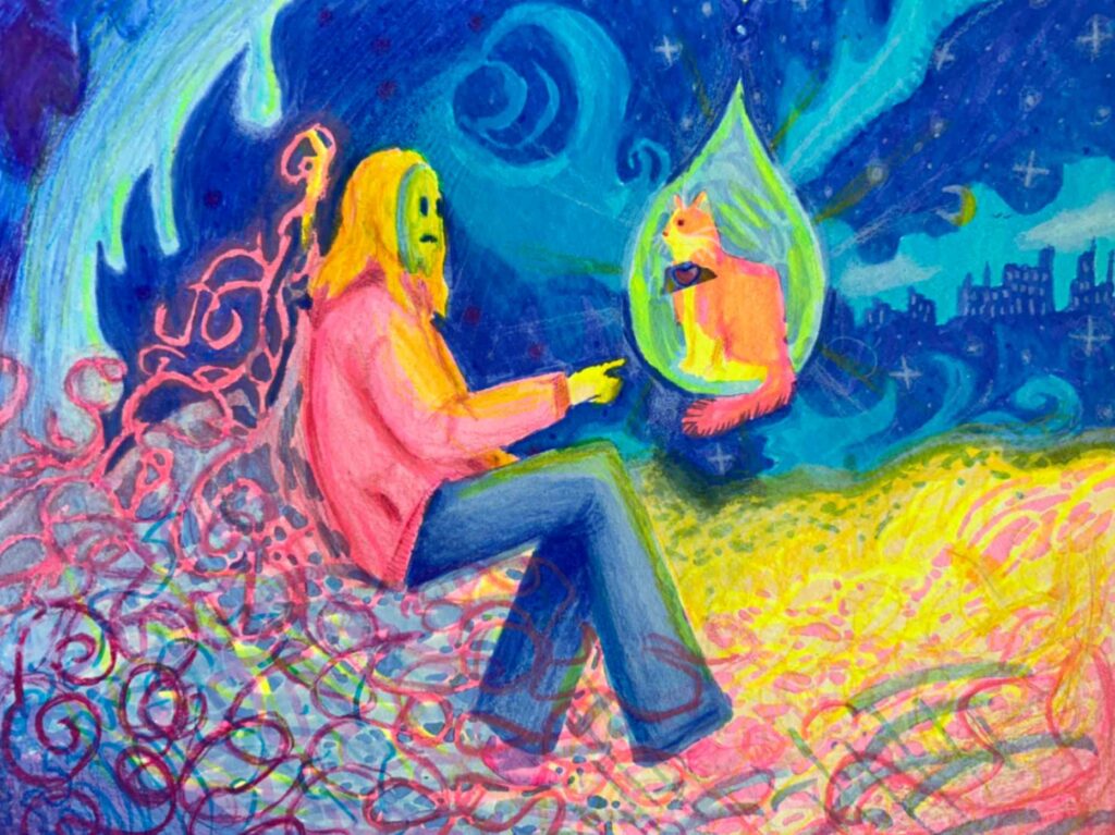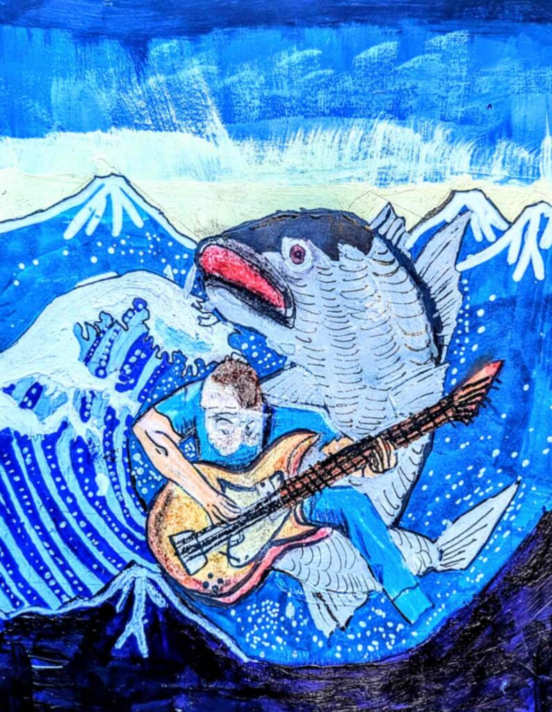 I made this work of art based on the things I think of like my fish tank and celestial objects. I’m also a fan of drawing eyes and the thought of someone watching over but not controlling how we live. Also, the sea to land reference and current events like wildfires and the thought of masculinity ruling over compared to feminism.