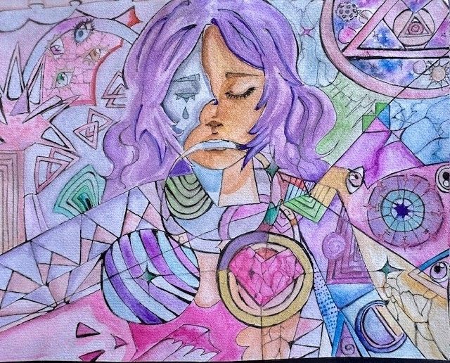 I used acrylic markers for this piece but mainly watercolors I also used a pen to do the line art. This abstract piece represents a heartbreak in a colorful manner. The background showing interests that can fade away with sorrow but also staying colorful as not to show anyone pain or sadness.