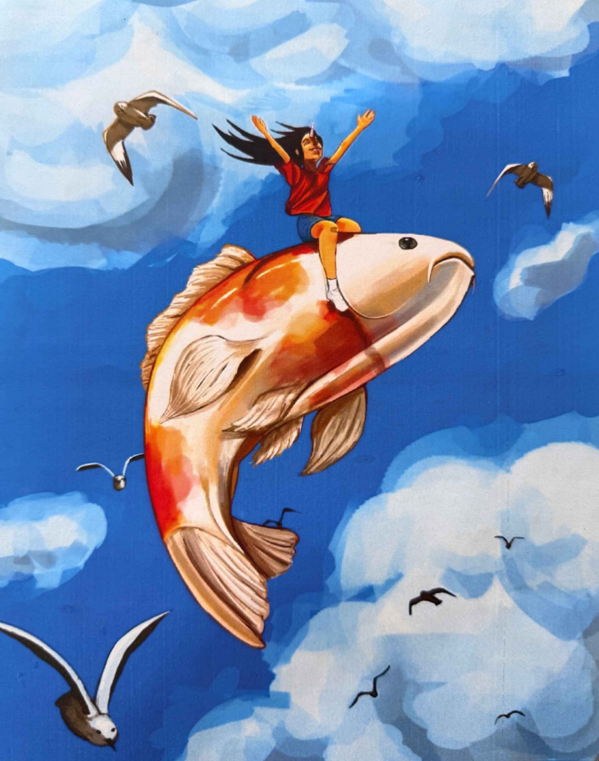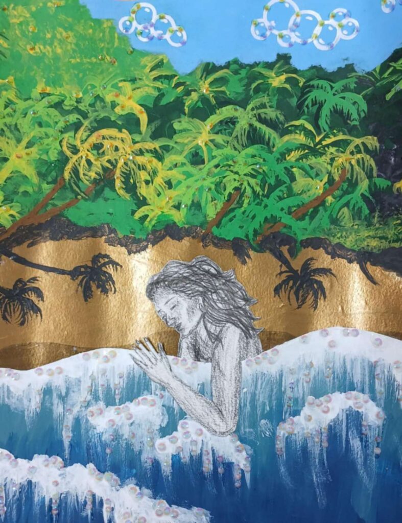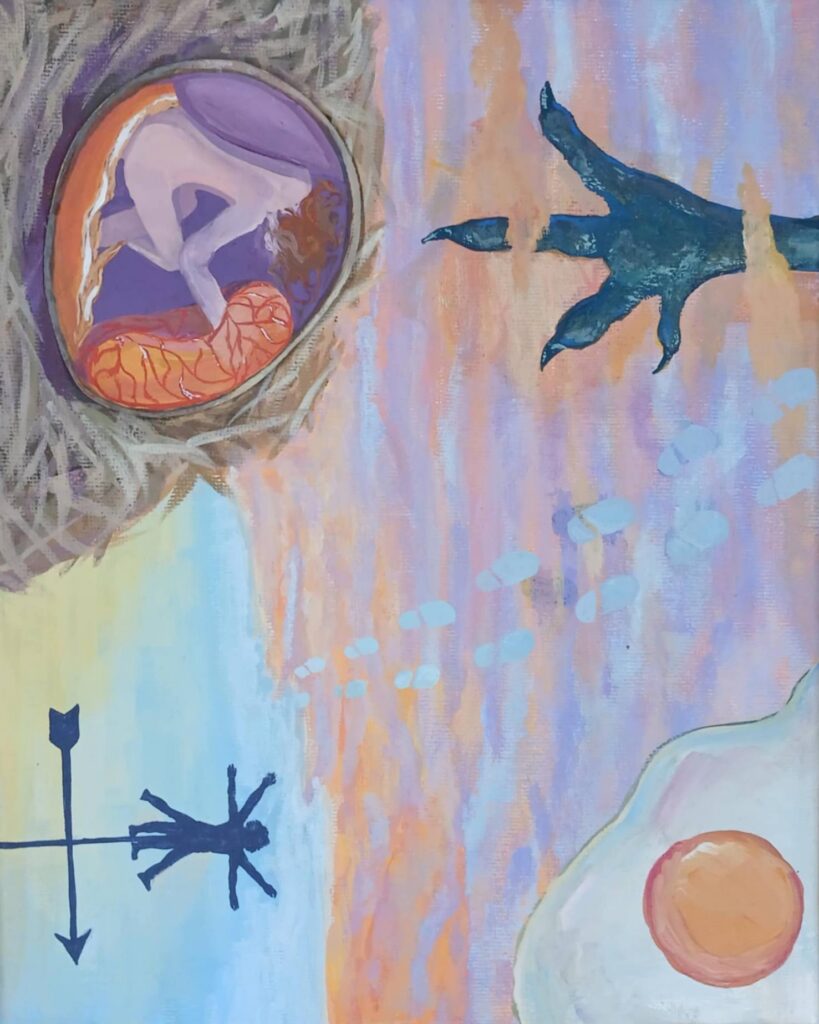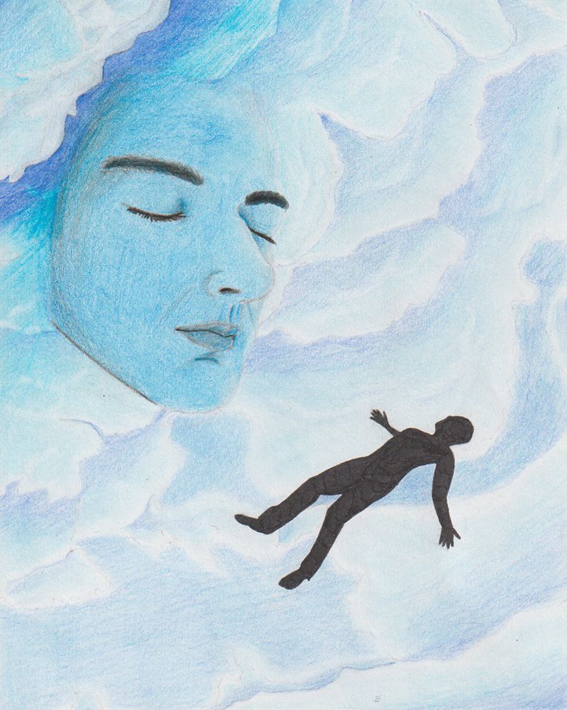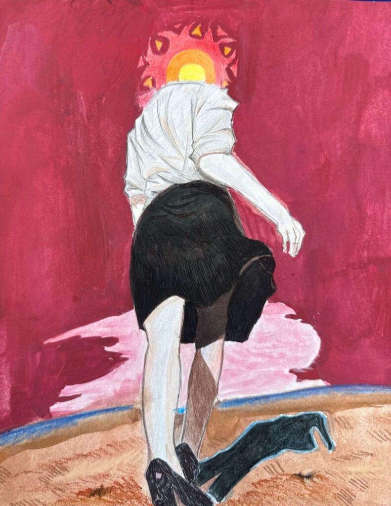 The mixed-media piece The Walk of Life is a surreal depiction of my original character, the Second Child of Life, as she walks towards the ocean. This piece represents Life as a character, the complex identity and journey of the average human. Her character is that she’s the middle child of the three descendants of Life, balancing mundane office work with the responsibilities of her siblings’ actions. The ocean represents the peace she chases, but will ultimately extinguish her flame.