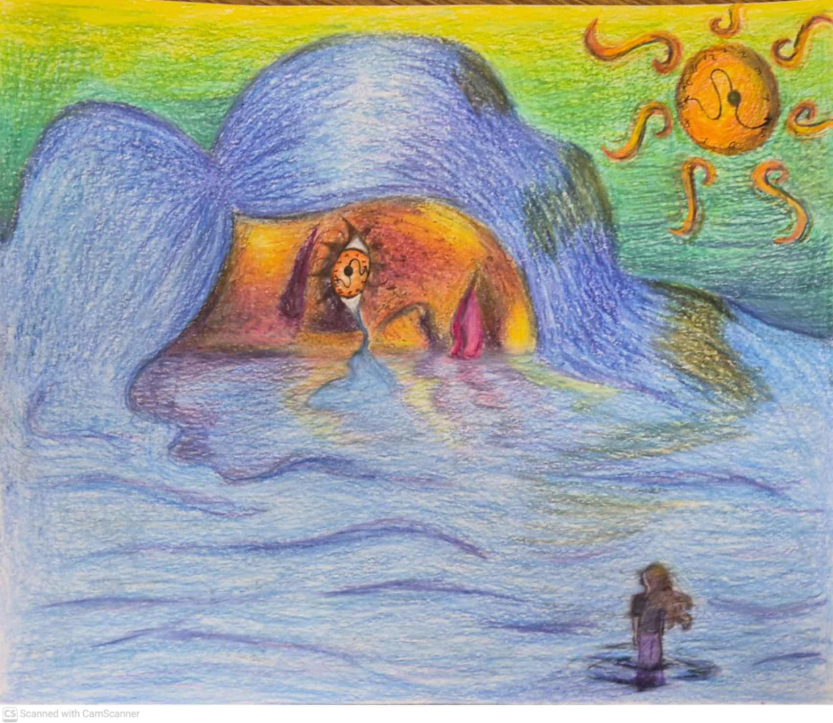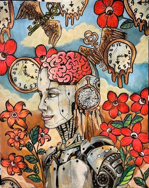 My artwork is about a robot girl who retains real feelings. I wanted to show that even though technology is a part of our lives, we still have thoughts, dreams, and emotions. The melting clocks, a direct reference to Dalí’s work, represent how time doesn’t always feel normal or the same to me. I want people to see that technology is not everything. Behind these machines, there is still a world where our imagination can be immense.