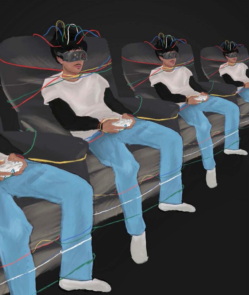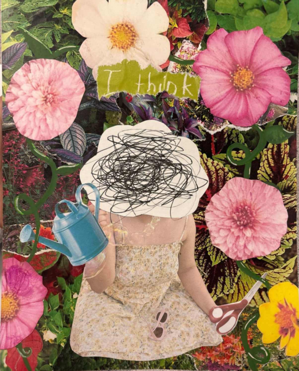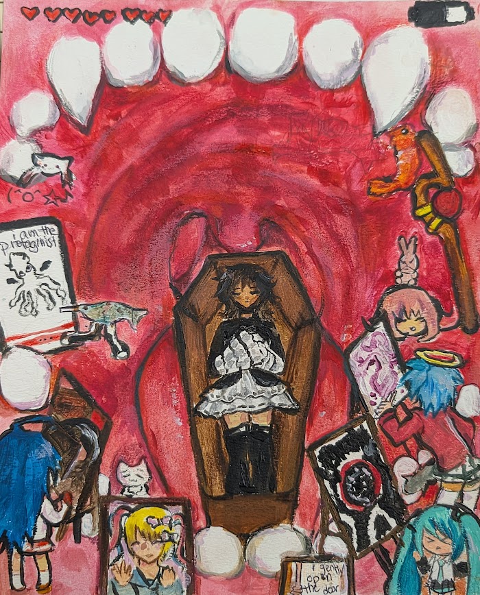 This piece portrays a representation of myself and my thoughts. The film strip surrounding the main figure is intended to reveal my long-lasting thoughts of hyper fixations throughout each day. I purposefully included more than one symbol to elaborate how I am never thinking of a singular aspect. These symbols also vary between specific franchises or interests I find most relatable and important to me.