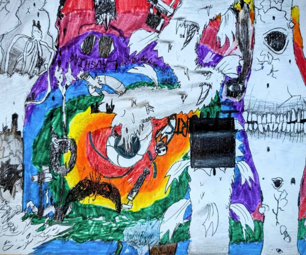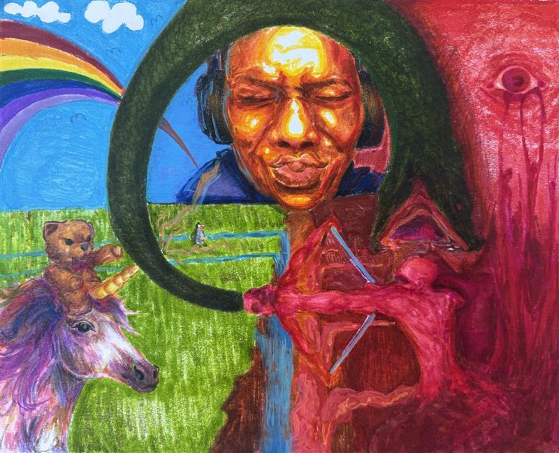 The drawing is a representation of me being lost in my own mind while being free from any stressful things going on in my life. It’s a place I can go to relax.