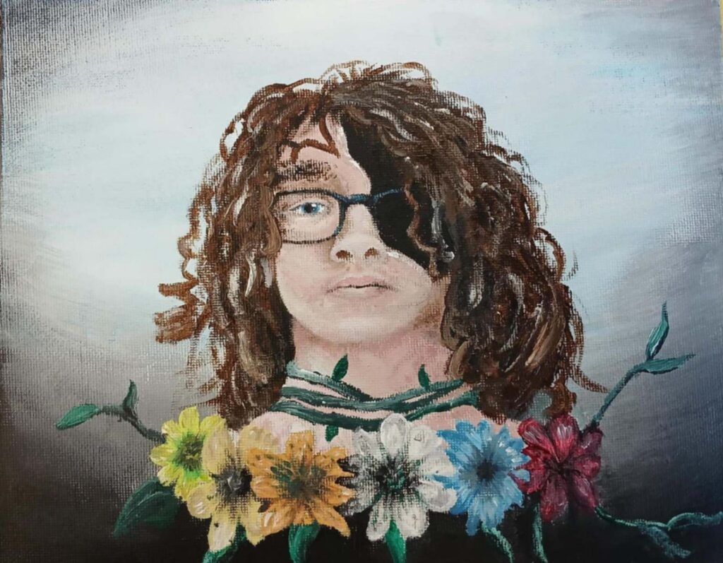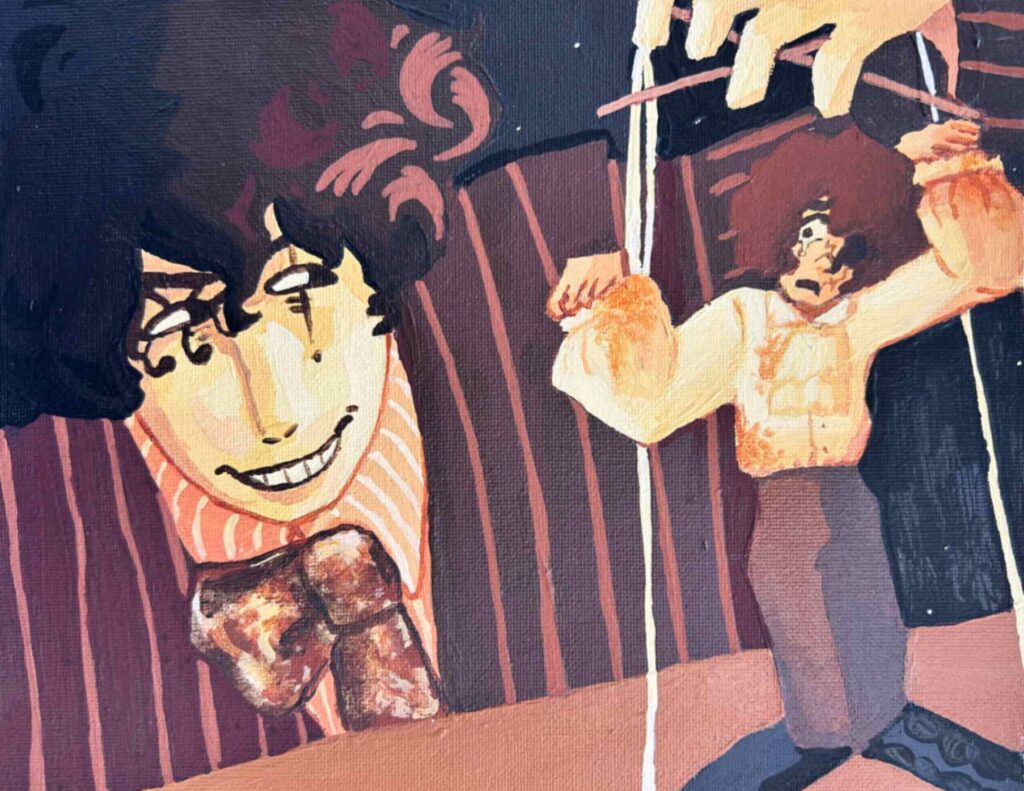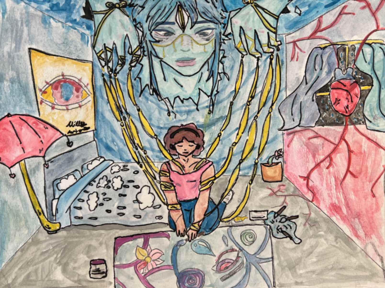 The artwork is filled with shades of blue, a color often used to represent sadness,loneliness and quiet emotions. The monster represents control and negative thoughts or outside pressures that manipulate a person without them even realizing it. And last, the girl is painting, an act that usually represents freedom, expression and identity. But the strings show that even her creativity is being controlled. She is not fully free.