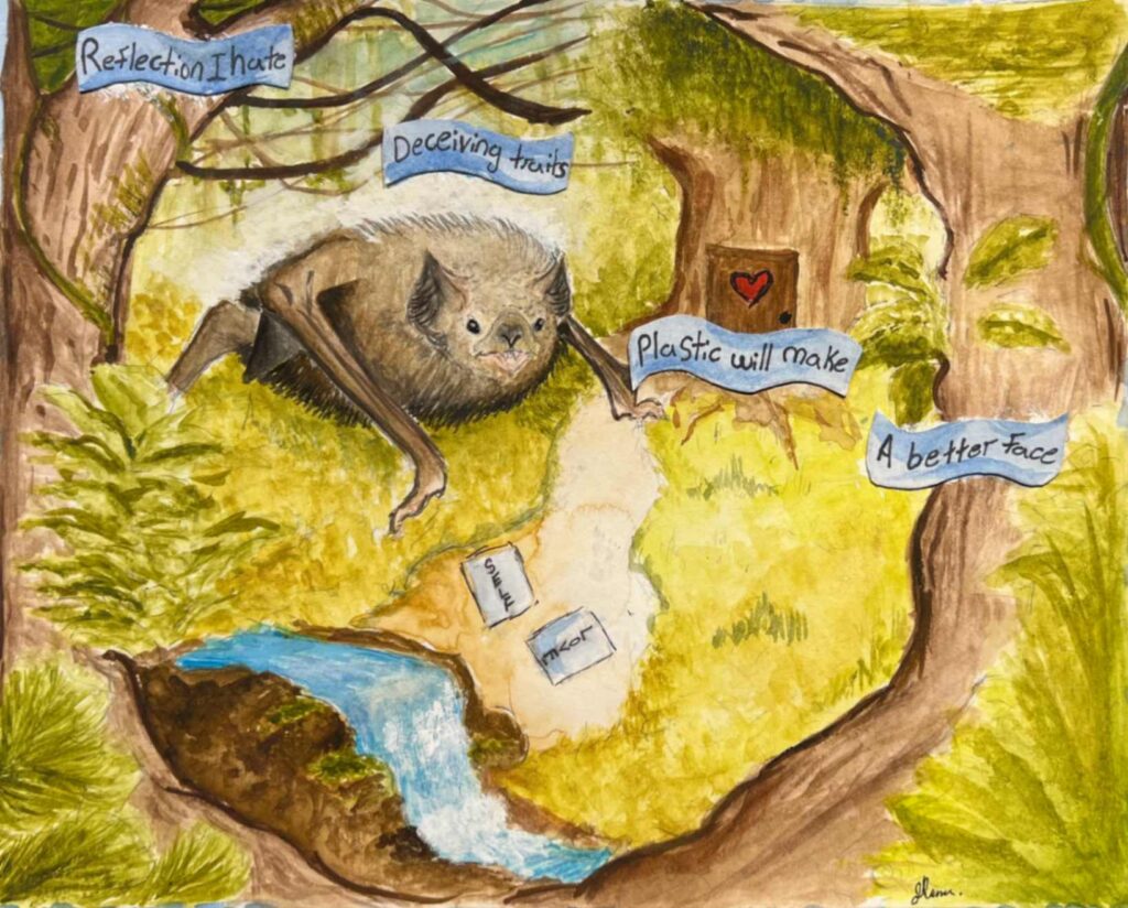 Home is best found when I’m by myself. The forest represents isolation. The oversized bat (me) would be out of place if it wasn’t in its home. The heart represents my safe place. I drew a flowing river along with matching floating words to represent how poetry flows easily when I’m in my own home space. The title of my poem on the pieces of paper on the trail lead you deeper to who I am.