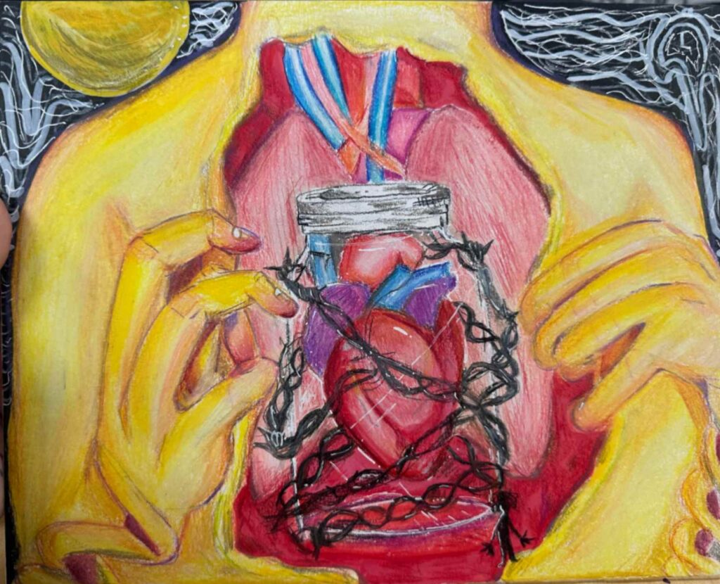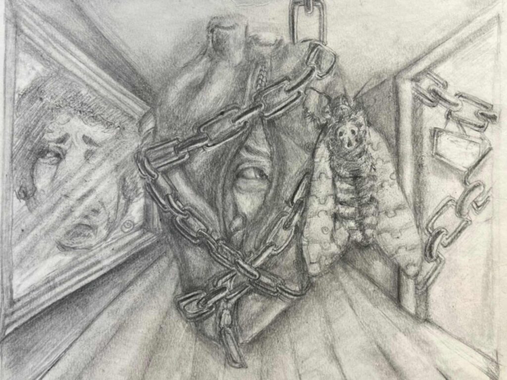 The art piece “don’t deny it” created by Aaliyah Greene walker represents a feeling of vulnerability and confinement. The chains represent feeling being trapped and refusal to acknowledge strong emotions, the mirror reflecting the man’s inner self forces the man to face the truth of how he truly feels. I have created this piece to display emotions I’ve seemingly been running from and refusing to face.