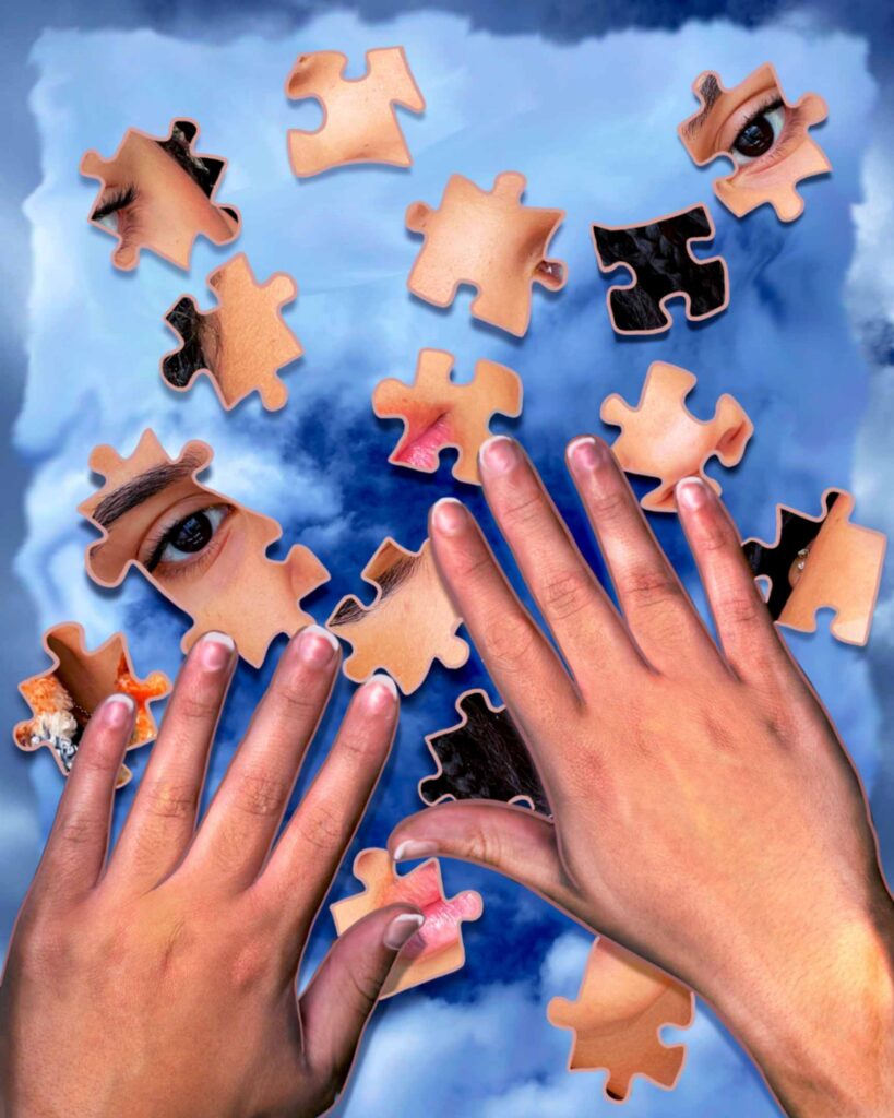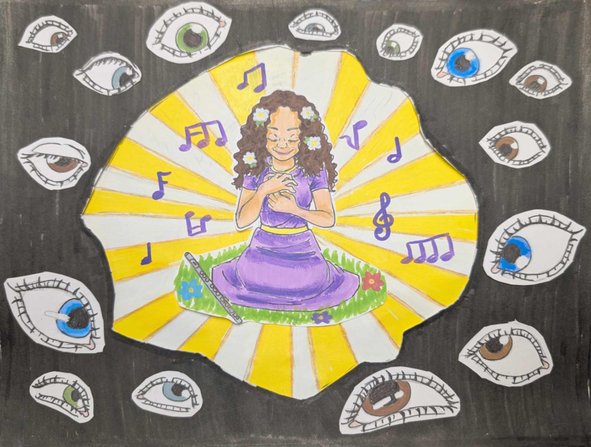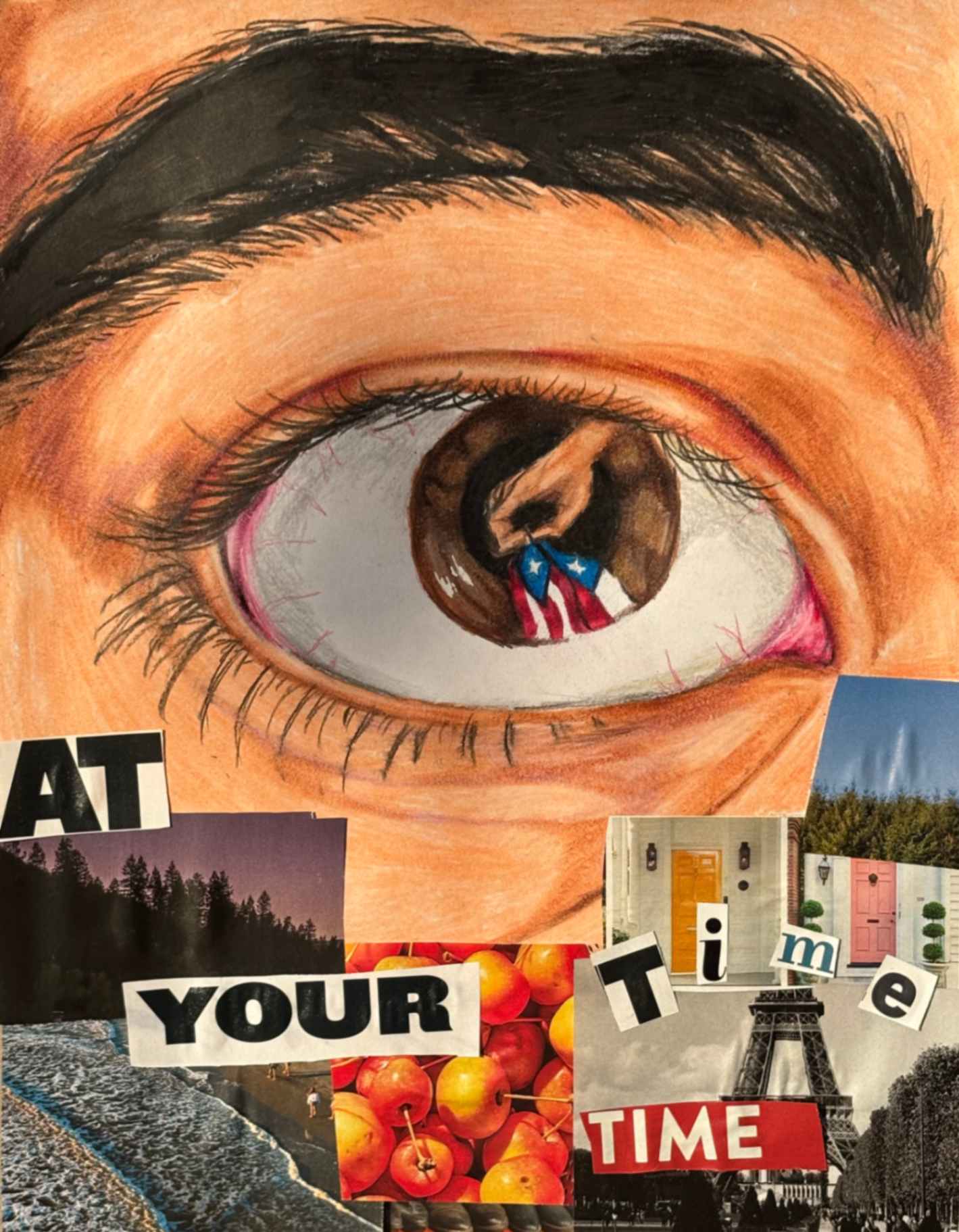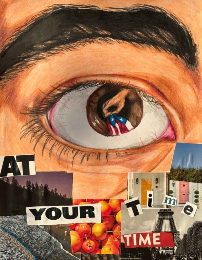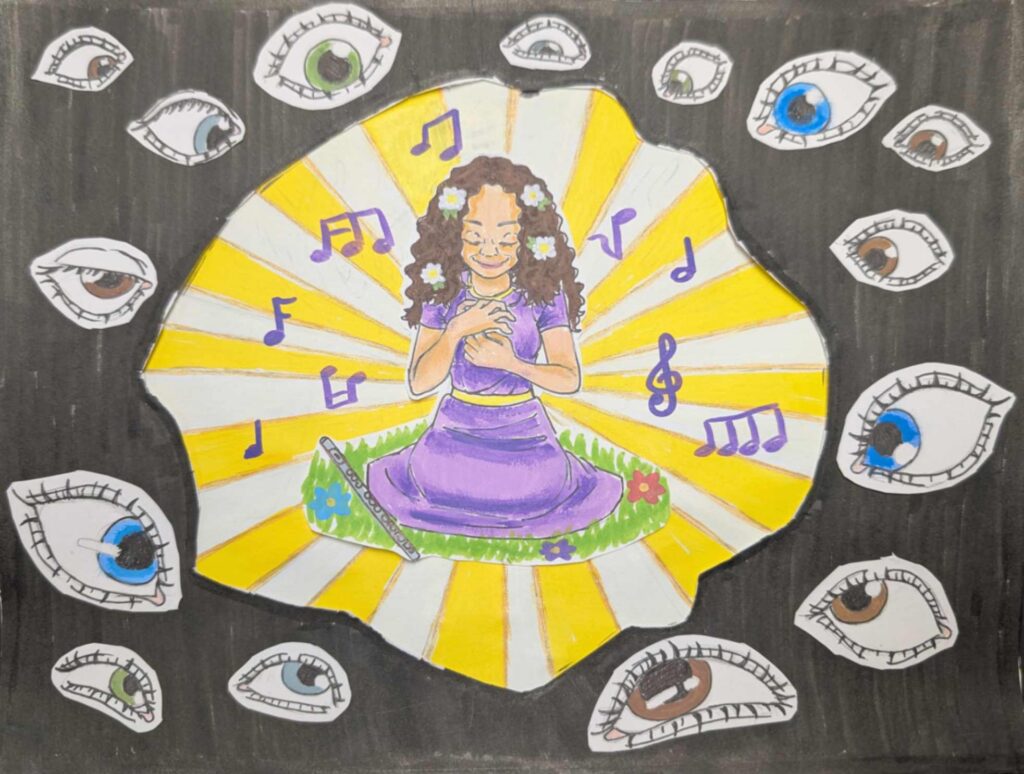 Music, colors, and fun inspire my journey. I made a surrealist composition using my personal symbols and images that describe me and my personality without using words. I was inspired by Salvador Dalí’s surreal elements; the eyes, impossible spaces, dreamlike scenes…I included fish-eye hybrids and many eyes to symbolize the feeling of being watched and judged. The sunset fading into my skin represents the insecurity and social comparison I used to struggle with.