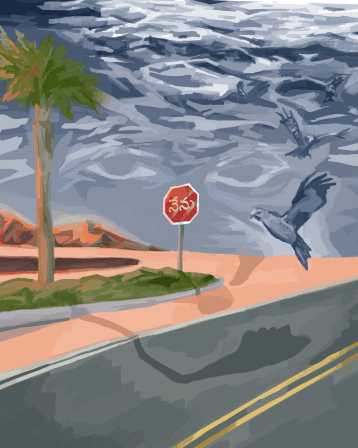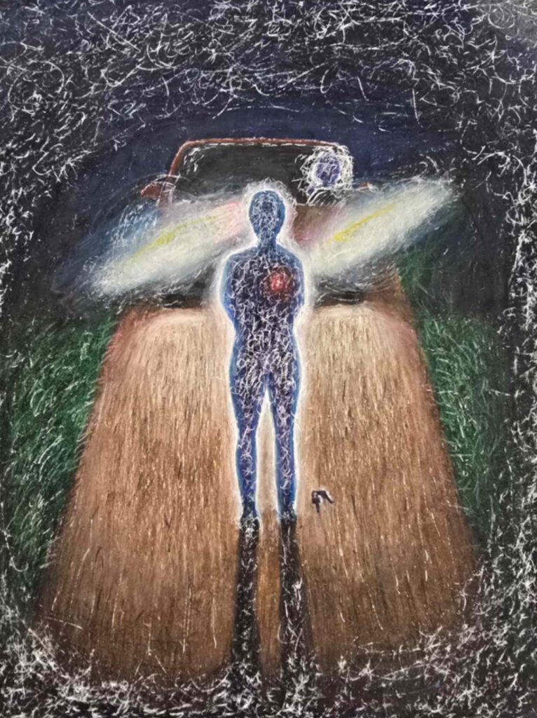 My work was created with many other options in mind, but after many trials that just didn’t feel right, I landed on this scenario. This scene portrays my sort of habits. The figure stopped in the road is the same as the face seen behind the wheel. My issues are usually self-inducing, and I forget to remind myself that it is up to me to make the decision to change the possible outcomes of things.