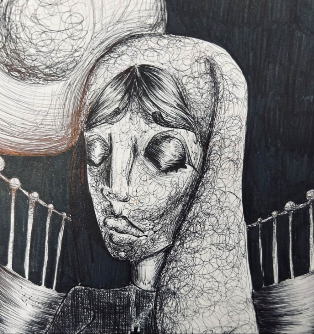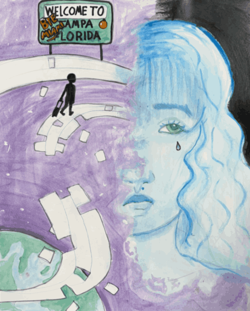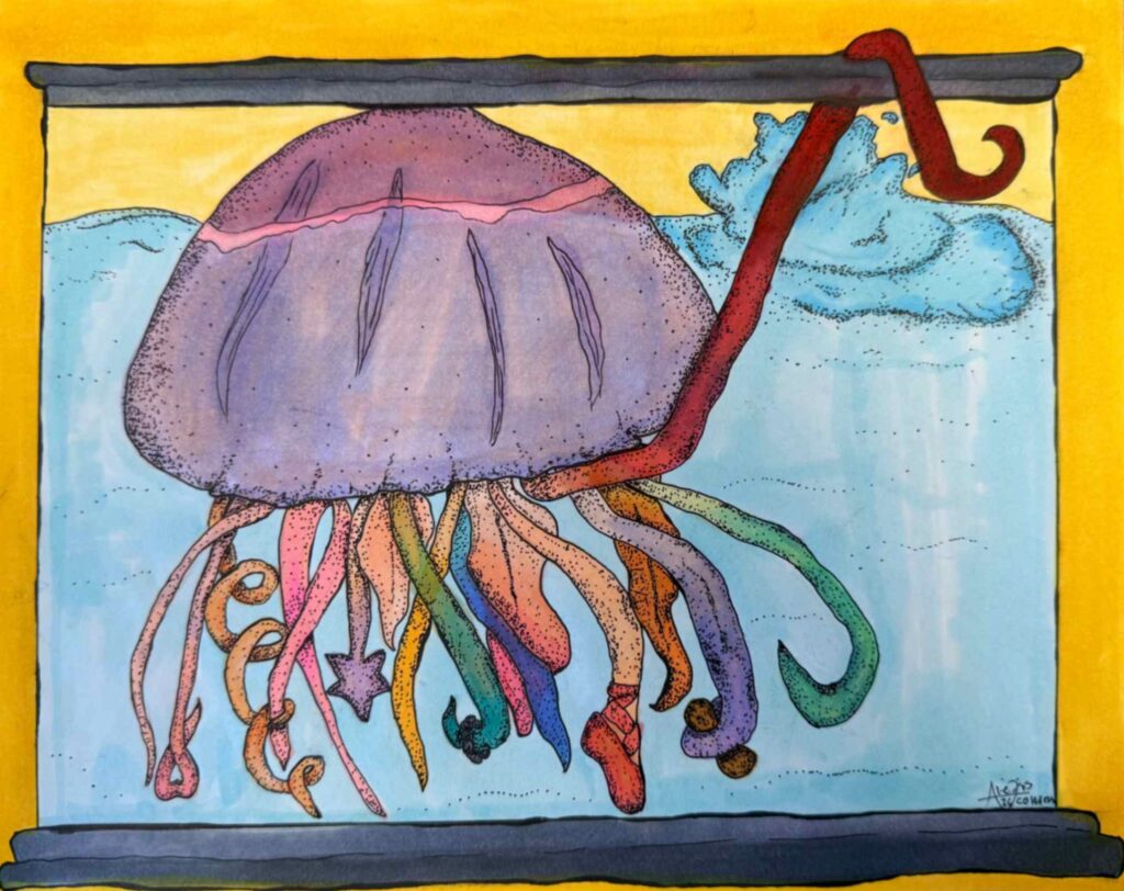 Many inspirations shaped this piece, reflecting who I am. Like a jellyfish, each tentacle represents a unique trait or story that defines me. While making the piece, I learned new ways to blend marker and use ink to create a surreal effect through scale, and symbolism. This piece is important to me because it represents the reach for an escape from isolation; and the water level represents how it is enough to function but not enough to thrive.