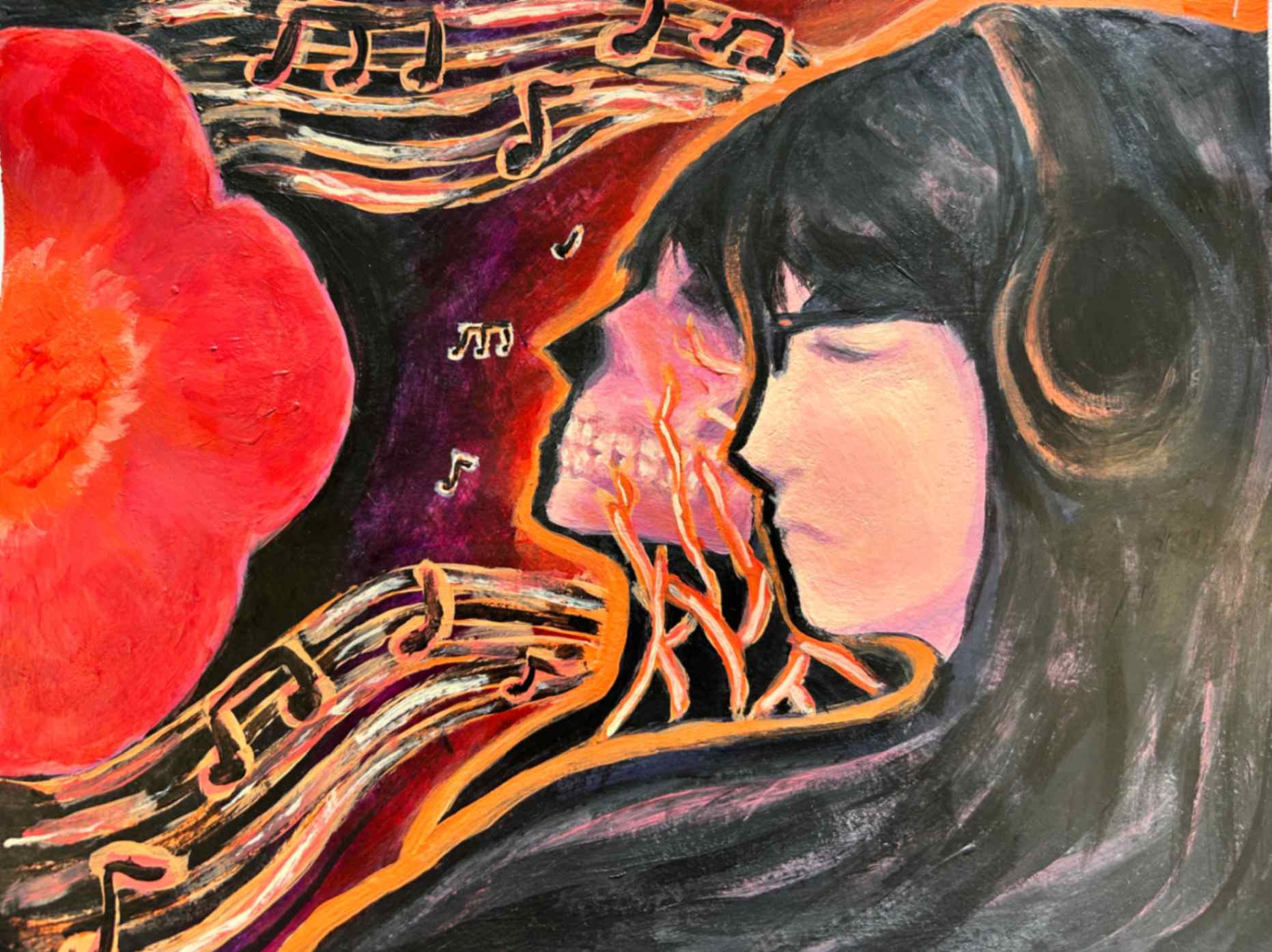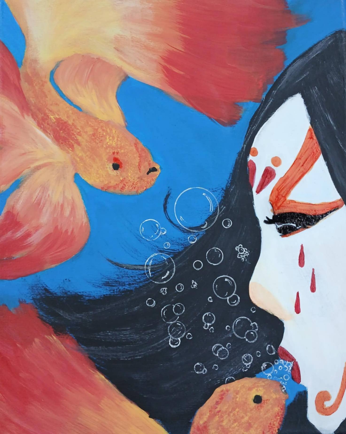 The inspiration for this piece was my first time experimenting with my creativity and the way it has positively affected my life. This piece represents the shock of having an awakening and the way it has evolved within me. The use of complementary colors represents the differences between my internal world and physical space.